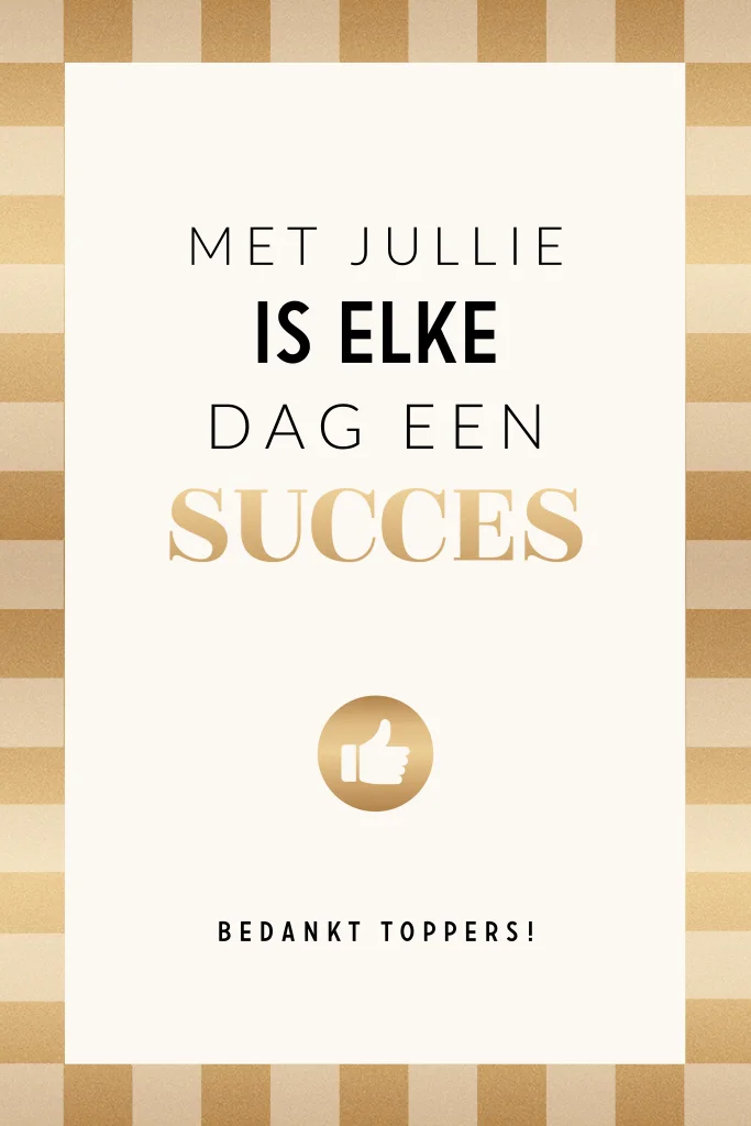 Zakelijke bedankkaart met de tekst 'met jullie is elke dag een succes' en een duimpje. De kaart heeft een goudlook omrand kader. Wie geef jij een compliment en geef je waardering voor zijn of haar inzet?