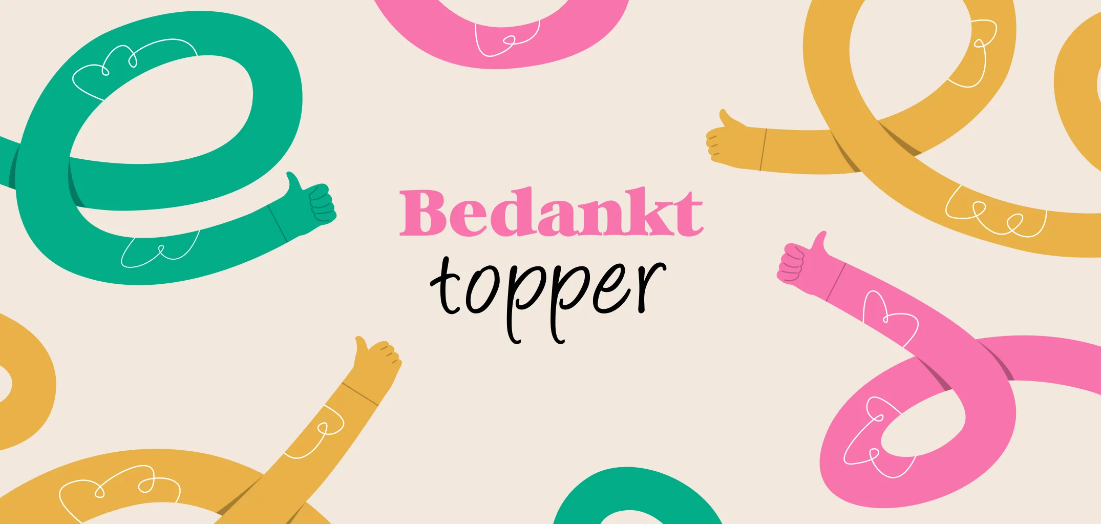 Zakelijke bedankkaart in kleurrijke kleuren om een compliment te geven aan jouw medewerkers, klanten of cliënten. Op deze kaart staat de tekst 'Bedankt topper' met in verschillende vrolijke kleuren armen met de duimpjes omhoog. Voeg een persoonlijke tekst toe op de achterzijde. De kleuren en teksten zijn aan te passen in de editor.