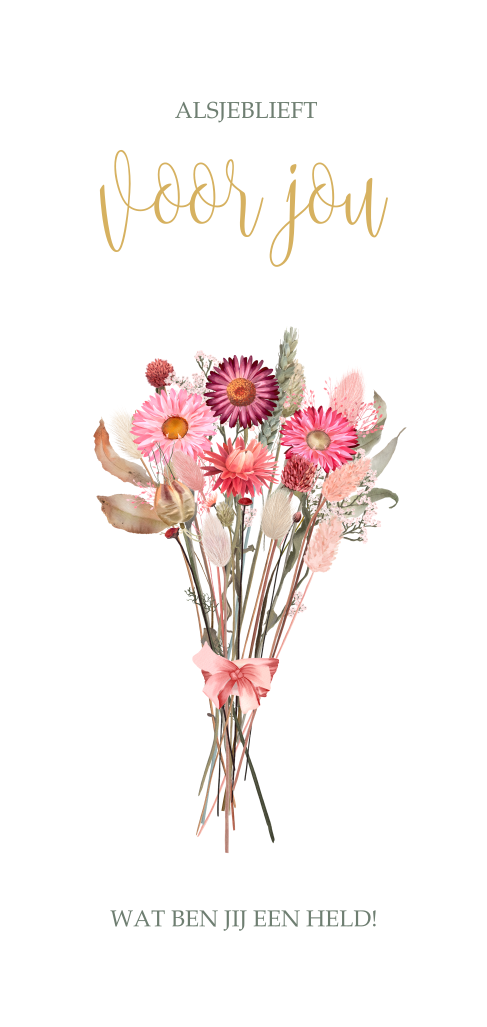 Dat verdient een bloemetje! Met deze samen sterk kaart kun je jouw medewerkers, klanten of clienten een gevoel van samen sterk meegeven. Op deze kaart staat een fleurig boeket bloemen. Voeg je eigen compliment of bedankje toe. De teksten en kleuren zijn aan te passen in de editor.