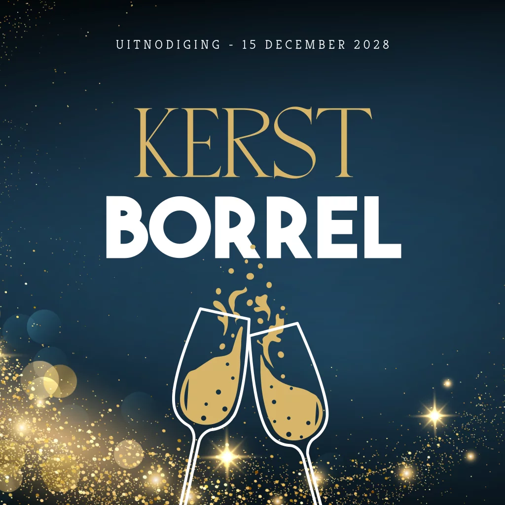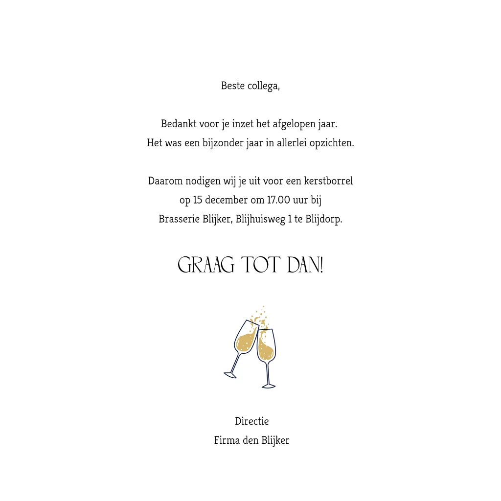 Nodig jouw medewerkers uit voor een kerstborrel! Zo kun je ze bedanken voor hun inzet in het afgelopen jaar. Deze uitnodiging heeft een aquarel achtergrond met proostende glazen. Pas deze kaart naar je eigen wensen aan in de editor.