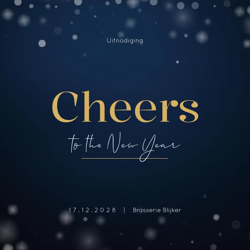 Uitnodiging voor een kerstborrel. Het woord cheers staat groot op de voorzijde in een strak lettertype in een gouden kleur. Een mooie combinatie met de donkerblauwe achtergrond en de goudkleurige spetters. Teksten, lettertypes en kleuren zijn naar je eigen smaak aan te passen in de editor.