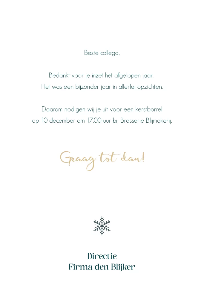 Stuur deze kaart naar je medewerkers om ze uit te nodigen voor een kerst borrel. Een leuke, originele manier om je medewerkers uit te nodigen om te proosten en terug te blikken op het afgelopen jaar. Deze kaart is naar je eigen wensen aan te passen in de editor.