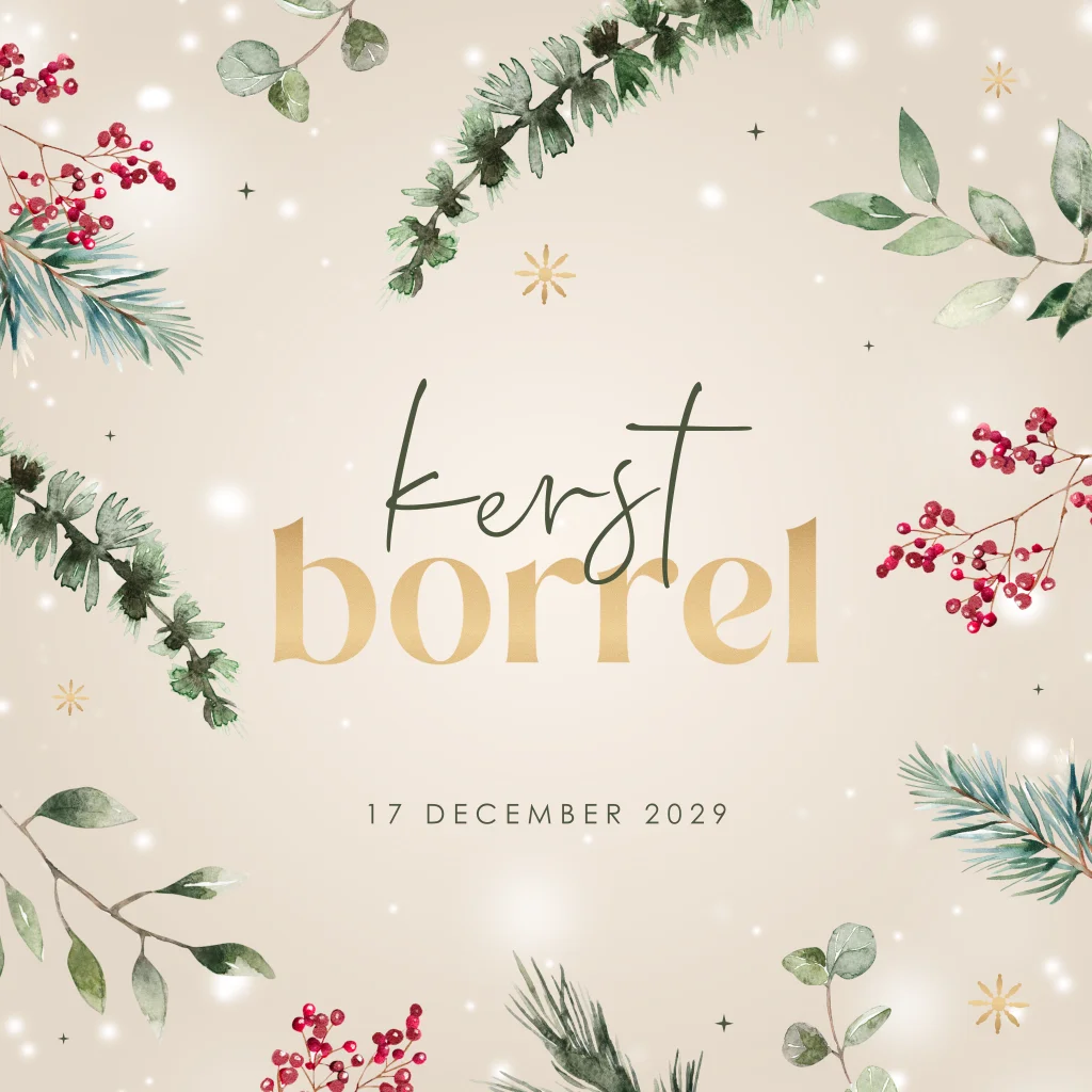 Een prachtige zakelijke uitnodiging voor een kerstborrel. Op deze kaart zie je verschillende kersttakken, een beige achtergrond en fonkelende sterretjes en sneeuwvlokken. Deze kerstkaart is erg leuk om naar je zakelijke relaties en werknemers te sturen.