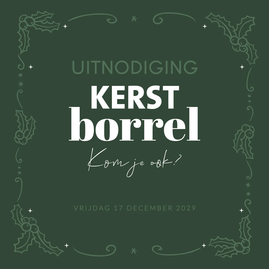 Luxe en stijlvolle zakelijke uitnodiging voor een kerstborrel. Deze zakelijke kerstkaart heeft een typische groene kerstkleur met hulst illustraties als omrand kader. De goudfolie geeft een luxe afwerking aan deze mooie kerstborrel uitnodiging.