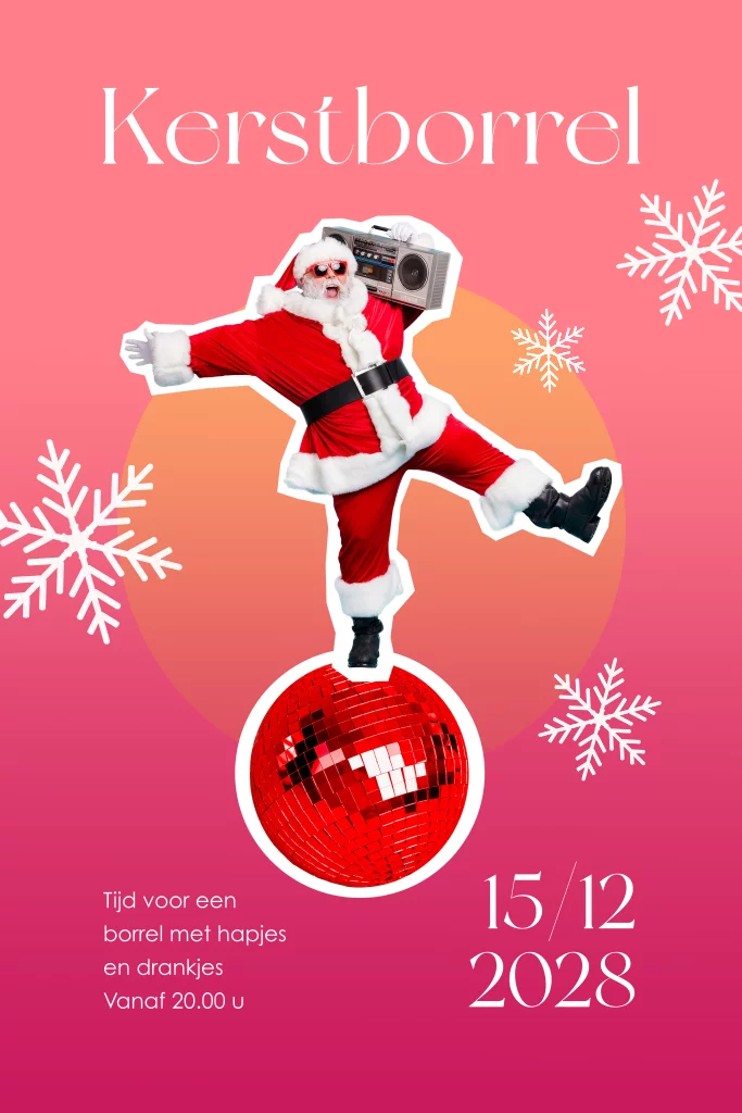 Een feestelijke en grappige kerstborrel uitnodiging! Op deze uitnodiging zie je een dansende kerstman op een discobal met daaromheen sneeuwvlokken. Met de handige ontwerpmodule kun je deze roze uitnodiging eenvoudig aanpassen naar jouw wensen. Pas de kaart aan en maak indruk op je medewerkers met deze unieke uitnodiging.
