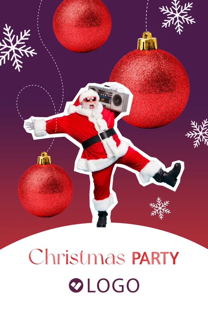 Deze toffe zakelijke uitnodiging voor een kerstborrel is perfect voor het organiseren van een feestelijke kerstborrel! Op deze kaart zie je een grappige swingende kerstman met zijn stereo. Hij danst tussen de kerstballen en sneeuwvlokken. De tekst Christmas party is vormgegeven in hoogglans en onder deze tekst kun je je eigen bedrijfsfoto toevoegen voor een persoonlijke touch. Nodig je zakelijke relaties en medewerkers uit voor een onvergetelijke kerstborrel met deze opvallende en feestelijke uitnodiging. Hulp nodig met je ontwerp? We helpen je graag!