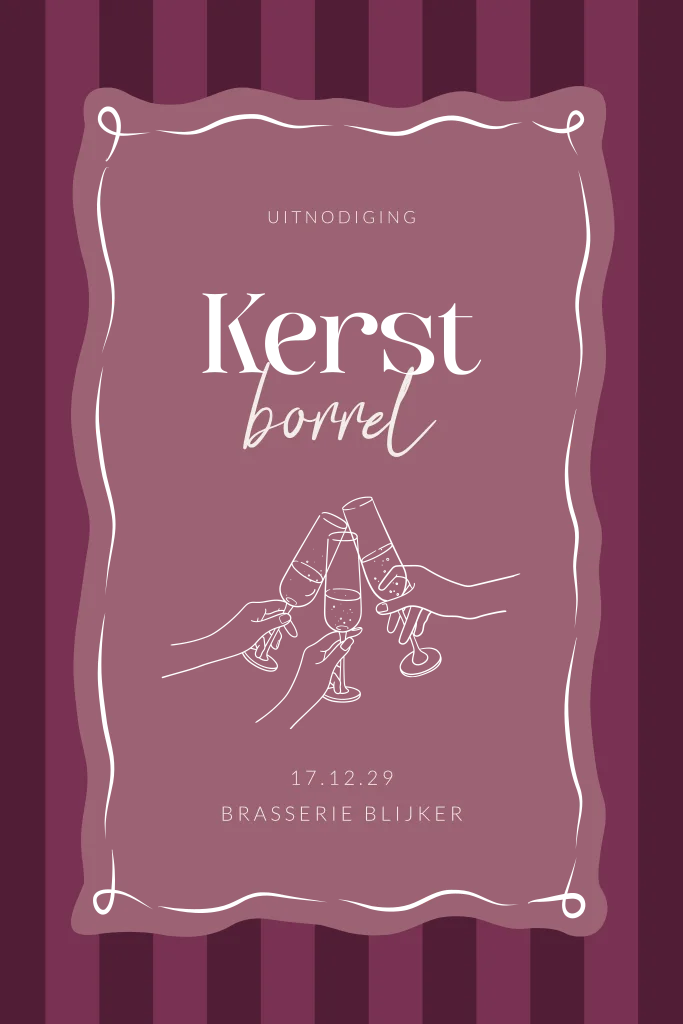 Een stijlvolle uitnodiging voor een kerstborrel met proostende champagne glazen. Een originele manier om je medewerkers te bedanken voor hun inzet en samen het glas te heffen op het nieuwe jaar. Deze uitnodiging heeft een mooie trendy burgundy kleur met strepen en een golvend kader. De goudfolie zorgt voor een luxe afwerking. Teksten en kleuren zijn aan te passen in de editor.