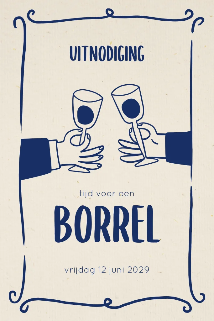 Zakelijke uitnodiging voor een borrel. Deze uitnodiging heeft een beige papierlook achtergrond met blauwe tekst en een blauw design van proostende handen met proostende glazen. Geschikt voor zowel een kerstborrel als een zomerborrel of een andere feestelijke gelegenheid. Op de achterzijde is ruimte voor een eigen bedrijfslogo. De afbeelding van het logo dient als voorbeeld en wordt niet gedrukt. Deze kun je verwijderen of plaats hier je eigen logo overheen.