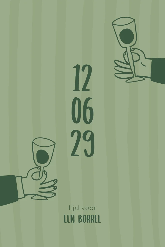 Iets zakelijks te vieren? Dan is het tijd voor een borrel! Nodig je medewerkers en zakelijke relaties uit met deze hippe zakelijke uitnodiging met strepen en proostende glazen. Ideaal voor een kerstborrel, zomerborrel, opening of ander zakelijk feest. De kaart heeft hippe afgeronde hoeken. Op de binnenzijde kun je je eigen bedrijfslogo plaatsen. De afbeelding van het logo dient als voorbeeld en wordt niet gedrukt. Deze kun je verwijderen of plaats hier je eigen logo overheen.