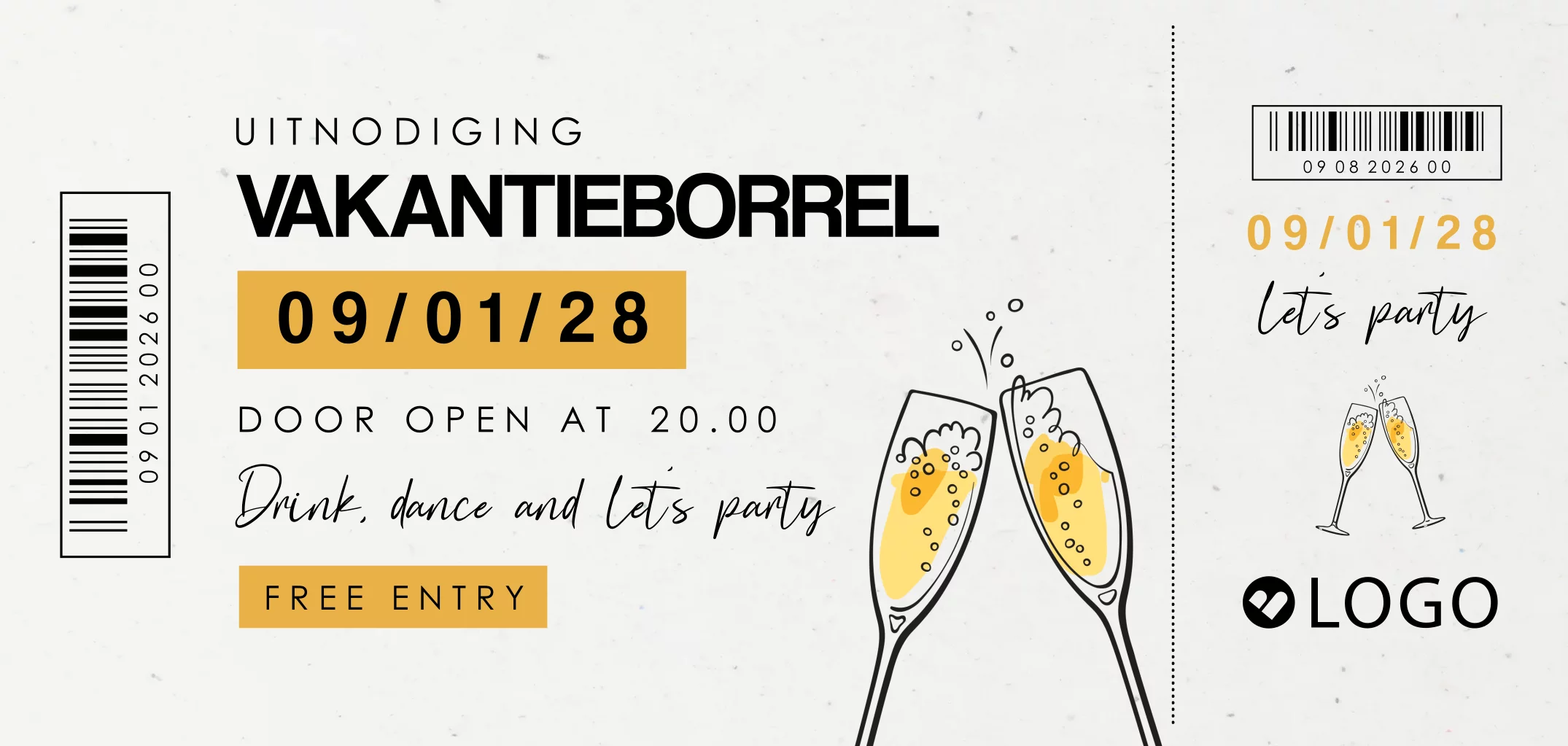 Duurzame zakelijke uitnodiging in ticketvorm voor een gezellige vakantieborrel. Deze unieke zakelijke uitnodiging is zeker geschikt voor bedrijven die duurzaam ondernemen met oog voor het milieu. Plaats een eigen bedrijfslogo op de voorkant op de uitnodiging en nodig verschillende mensen uit. De afbeelding van het logo dient als voorbeeld en wordt niet gedrukt. Deze kun je verwijderen of plaats hier je eigen logo overheen. De teksten en kleuren zijn aan te passen in de editor.