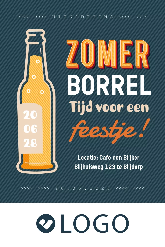 Nodig al je personeel uit voor een zomerborrel om samen de vakantie in te luiden. Deze uitnodiging heeft een typografisch ontwerp met een illustratie van een bierflesje. Op zowel de voorzijde als de achterzijde is ruimte voor jullie eigen logo. Stuur deze zakelijke uitnodiging naar je personeel en laat ze weten dat het tijd is voor een feestje!