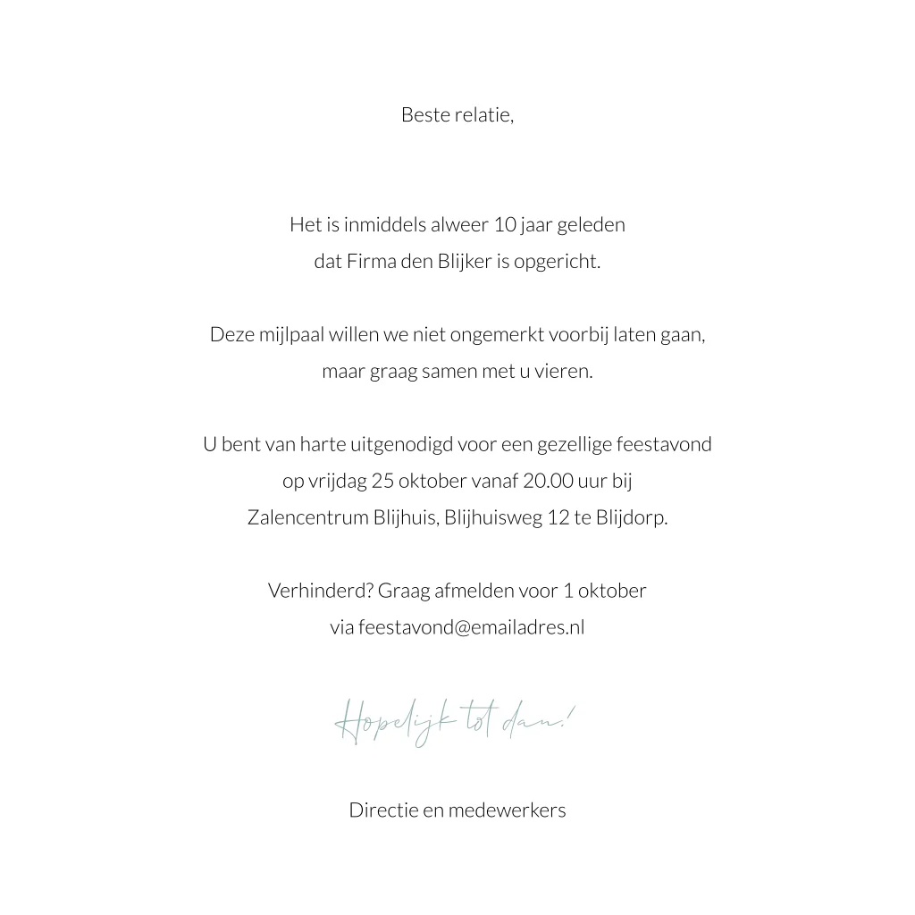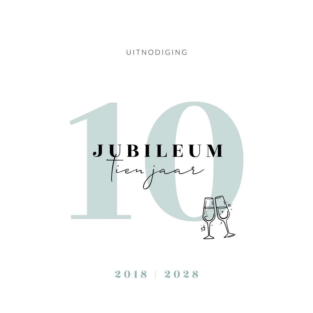 Stijlvolle zakelijke uitnodiging voor een bedrijfsjubileum. Dit ontwerp is voor een bedrijf dat een 10-jarig jubileum viert, maar het getal is eenvoudig aan te passen naar een ander jubileum jaar. Een mooie combinatie van verschillende lettertypes en rustige kleuren maakt deze kaart geschikt voor elke branche of sector. De proostende champagne glazen maken deze uitnodiging extra feestelijk. Pas de kaart naar je eigen wensen aan. Hulp nodig? We helpen er graag bij.