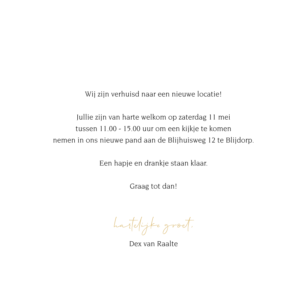 Organiseer jij een feestelijke opening voor je nieuwe zaak of omdat jullie bedrijf is verhuisd naar een andere locatie? Met deze uitnodigingskaart nodig je familie, vrienden en zakelijke relaties uit om jouw nieuwe bedrijf te komen bekijken. Op de voorzijde is ruimte voor een eigen logo en kun je een mooie foto van bijvoorbeeld het nieuwe pand toevoegen. Teksten, kleuren en lettertypes zijn aan te passen in onze ontwerpmodule. Kom je er zelf niet uit? We helpen je graag.