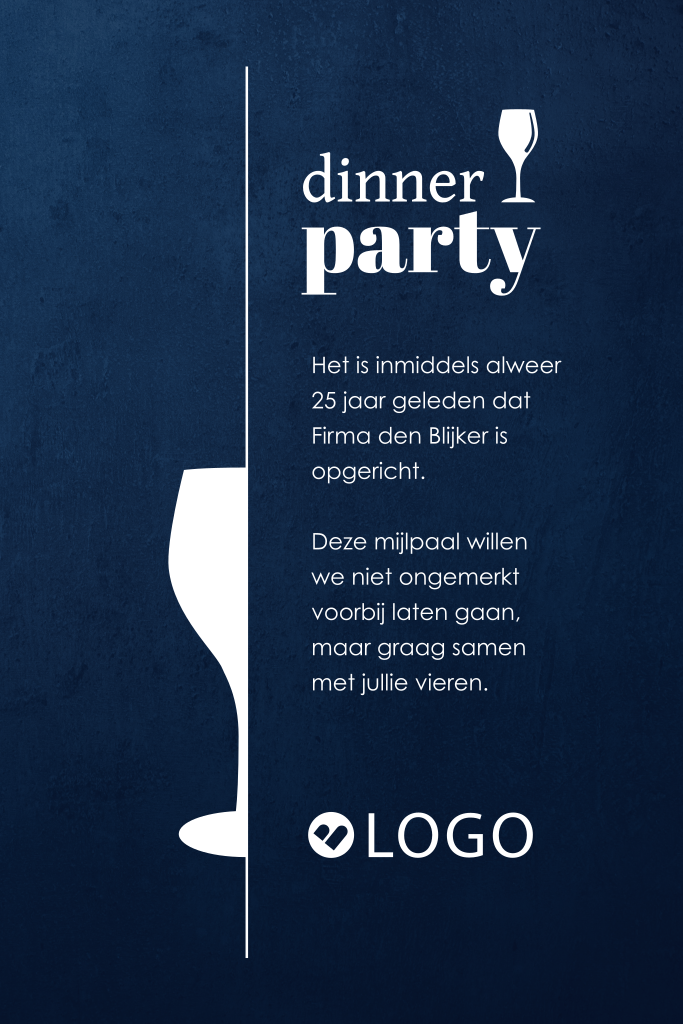 Strakke stijlvolle zakelijke uitnodiging voor een bedrijfsjubileum. De kaart heeft een blauwe achtergrond met betonlook effect met witte tekst en wijnglazen. Dit ontwerp is voor een 25-jarig jubileum, maar de getallen zijn gemakkelijk aan te passen zodat de kaart ook geschikt is voor andere jubileumjaren. De ronde hoeken geven een mooi effect aan deze zakelijke uitnodiging.