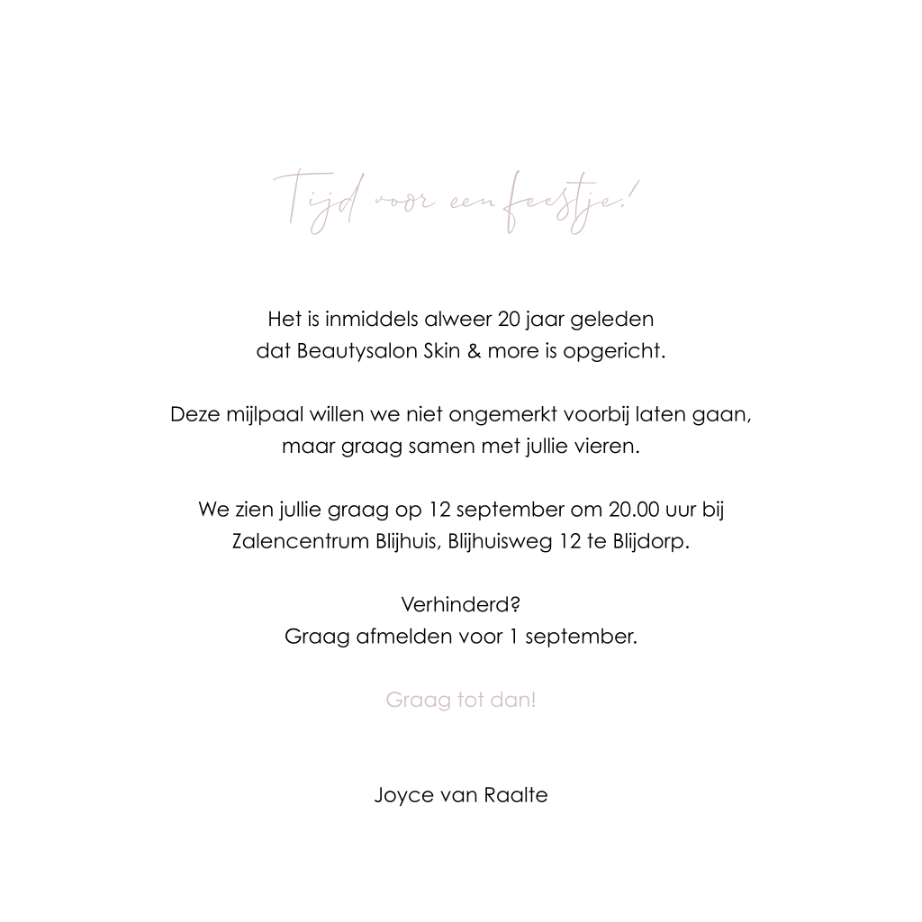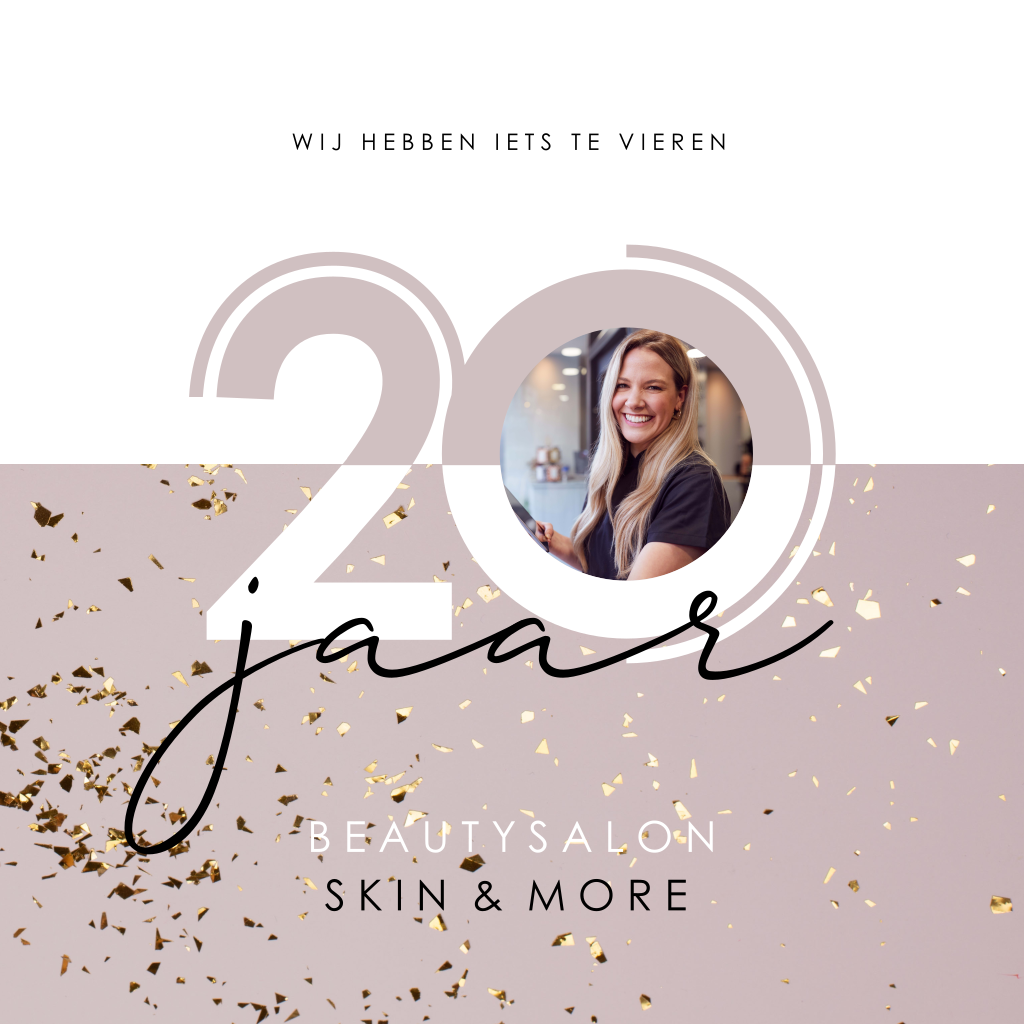 Mooie zakelijke uitnodiging voor een 20-jarig jubileum. Zowel op de voor- als op de binnenzijde kun je een foto plaatsen, van jezelf, personeel of je bedrijf. Op de voorzijde een foto in het getal 20, dat geeft een leuk effect. De gouden confetti maakt de kaart extra feestelijk. In deze kaart is een beautysalon als voorbeeld gebruikt, maar deze uitnodiging is ook voor een andere sector of branche geschikt. De kleuren, lettertypes en teksten kun je zelf aanpassen in de ontwerpmodule. Ook kun je de foto's gemakkelijk vervangen voor eigen foto's. Hulp nodig? We helpen je graag!