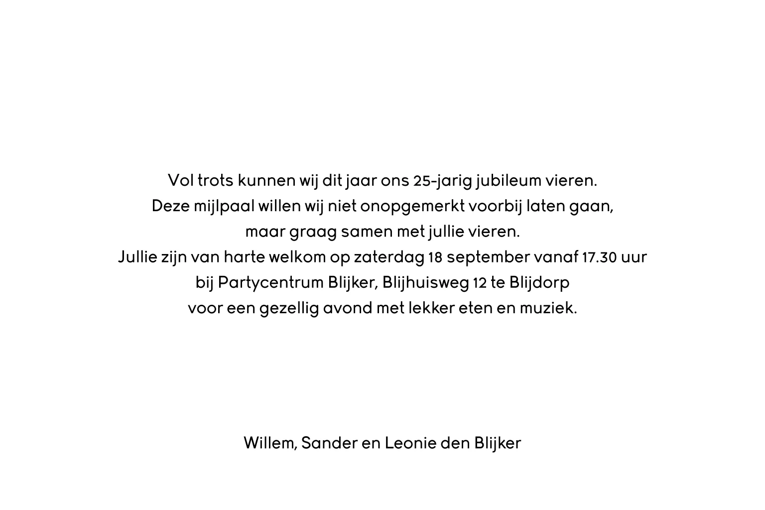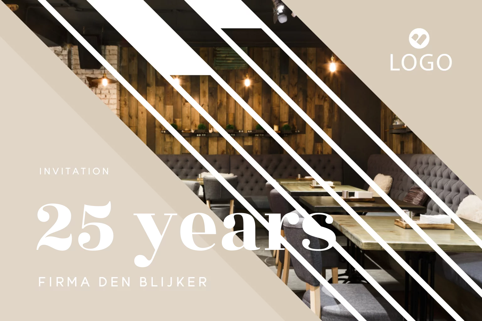 Hippe moderne zakelijke uitnodiging. Deze uitnodiging is geschikt voor een 25-jarig zakelijk jubileum maar kun je gemakkelijk aanpassen naar andere jubileumjaren. De uitnodiging heeft een beige achtergrond met strakke lijnen en eigen bedrijfsfoto. De goudfolie en ronde hoeken geven een luxe en hippe uitstraling aan deze zakelijke jubileumkaart. Dit is een originele en moderne manier om jullie boodschap over te brengen en zal zeker indruk maken op jullie klanten of gasten. Bovendien is het een geweldige manier om je bedrijf of organisatie te promoten.