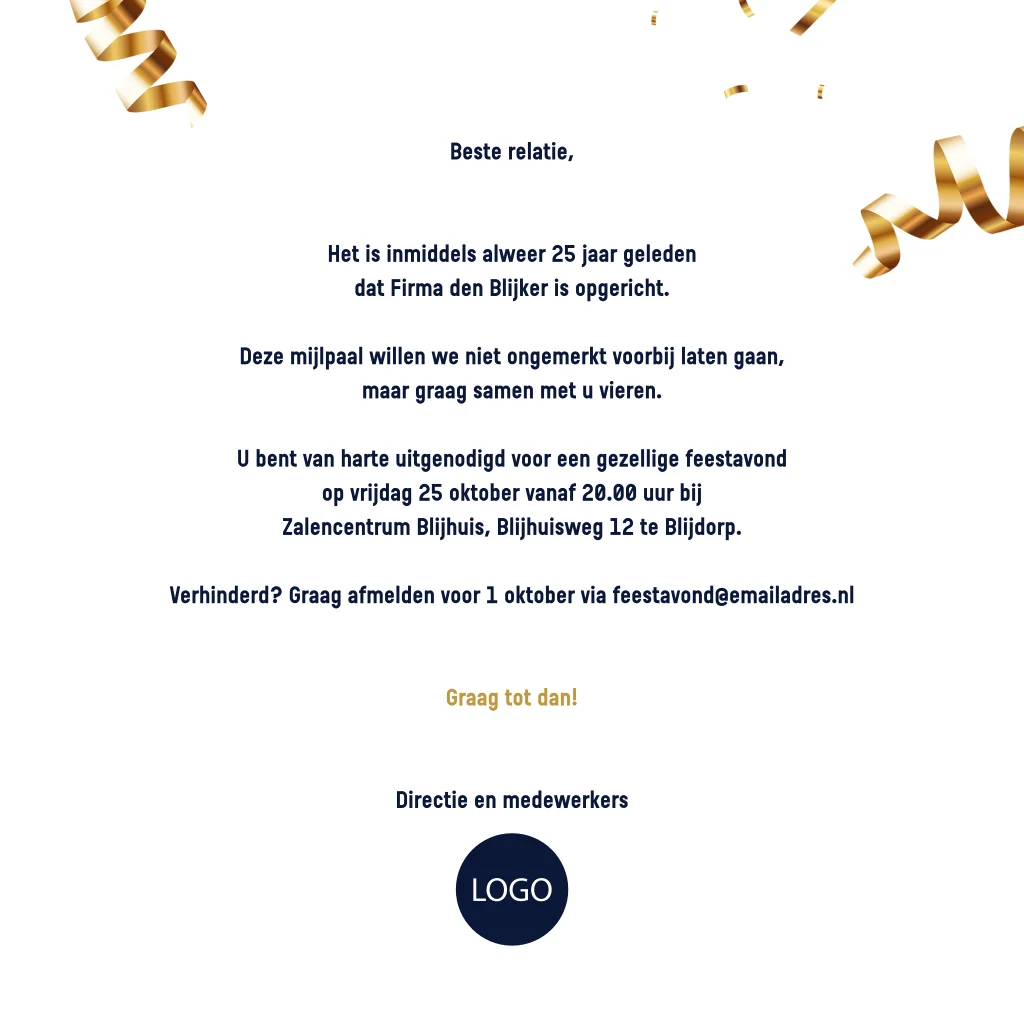 Vier jullie 25-jarig bedrijfsjubileum met deze moderne zakelijke uitnodigingskaart. De gouden confetti maakt de kaart extra feestelijk.