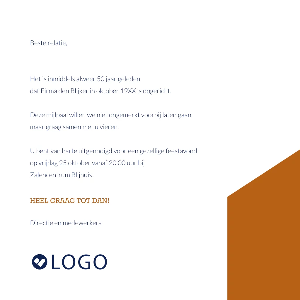 Jubileum uitnodiging zakelijk met vlakverdeling, foto en logo