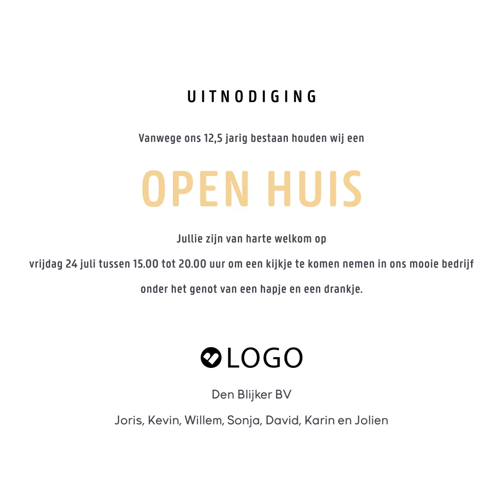 Zakelijke uitnodiging voor een open huis. De goudlook confetti en gouden met zwarte ballonnen geven de kaart een stijlvolle en feestelijke uitstraling.