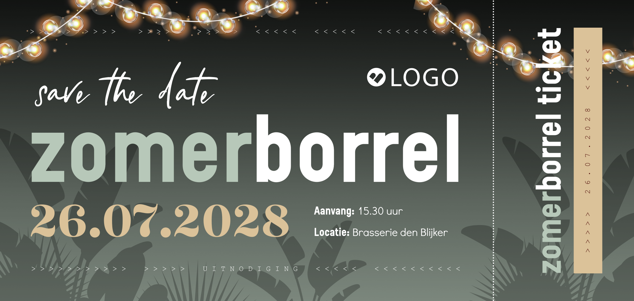 Op zoek naar een originele zakelijke uitnodiging? Kies dan voor een uitnodiging in de vorm van een ticket. Nodig al je personeel uit voor een zomerborrel met bbq om samen de vakantie in te luiden. Met een ticket als uitnodiging mét eigen bedrijfslogo maak je zeker indruk op je gasten. Hulp nodig bij het aanpassen van deze kaart? We helpen je er graag bij.