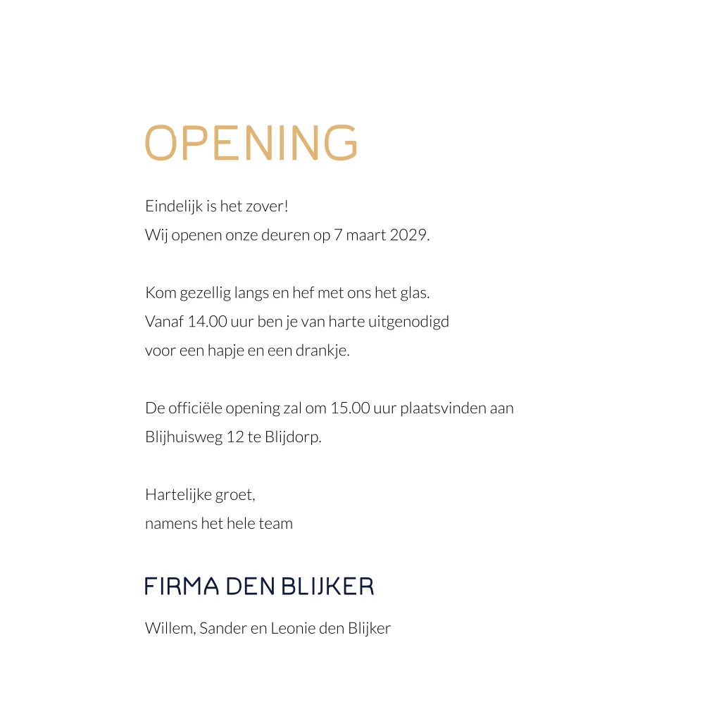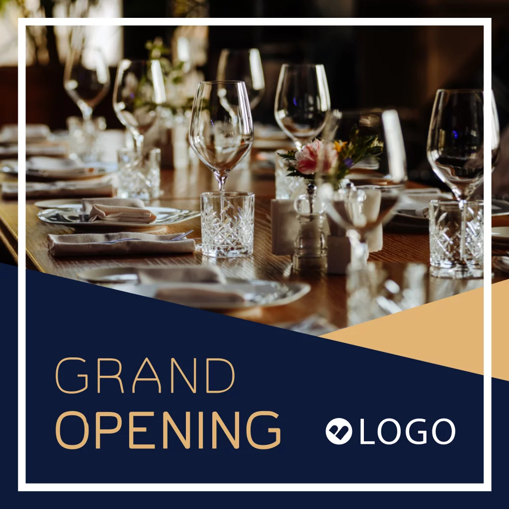 Grand opening uitnodigingskaart. Vier de opening van jullie nieuwe zaak of pand met deze strakke en stijlvolle uitnodiging. De kaart heeft een schuine vlakverdeling met een foto van een gedekte tafel. De foto, teksten, kleuren en het logo pas je eenvoudig aan in de editor. De afbeelding van het logo dient als voorbeeld en wordt niet gedrukt. Deze kun je verwijderen of plaats hier je eigen logo overheen.