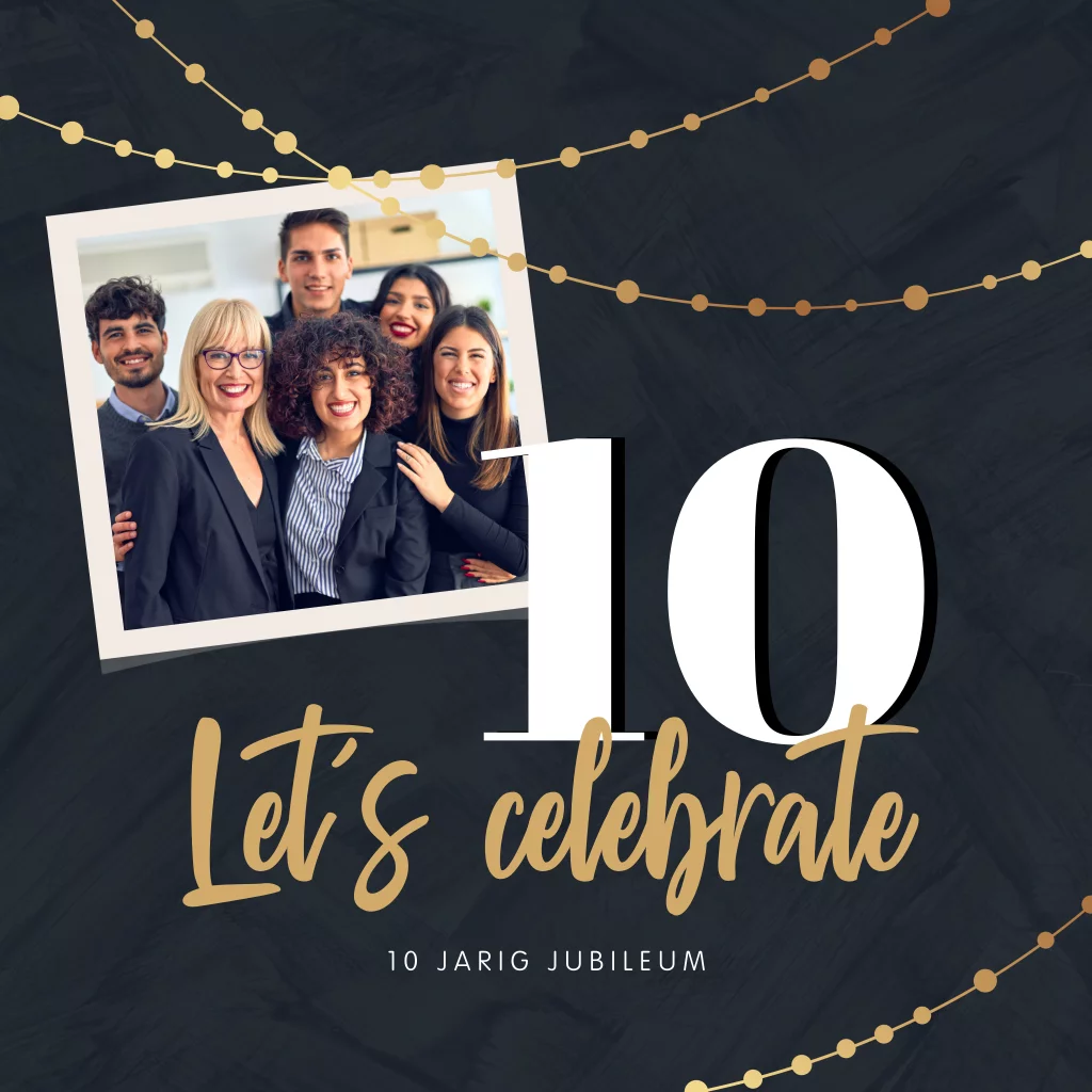 Bestaat jullie bedrijf 10 jaar? Let's celebrate! Feestelijke zakelijke uitnodigingskaart voor een 10-jarig zakelijk jubileum. Op deze kaart een zwarte krijtbord achtergrond en een gezellige lampen slinger. Zet in het kader een foto jullie zelf of je bedrijf. Alle teksten en kleuren zijn gemakkelijk aan te passen in onze editor.