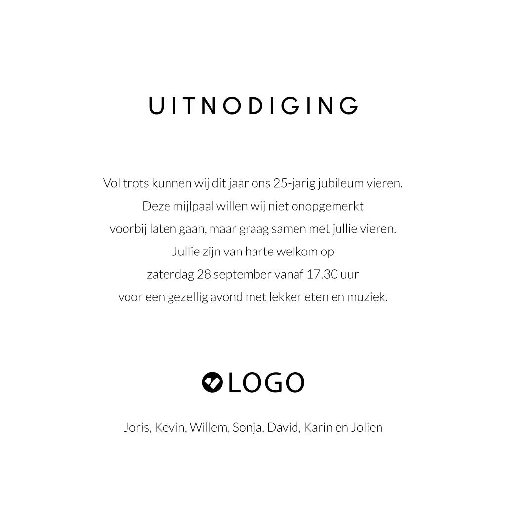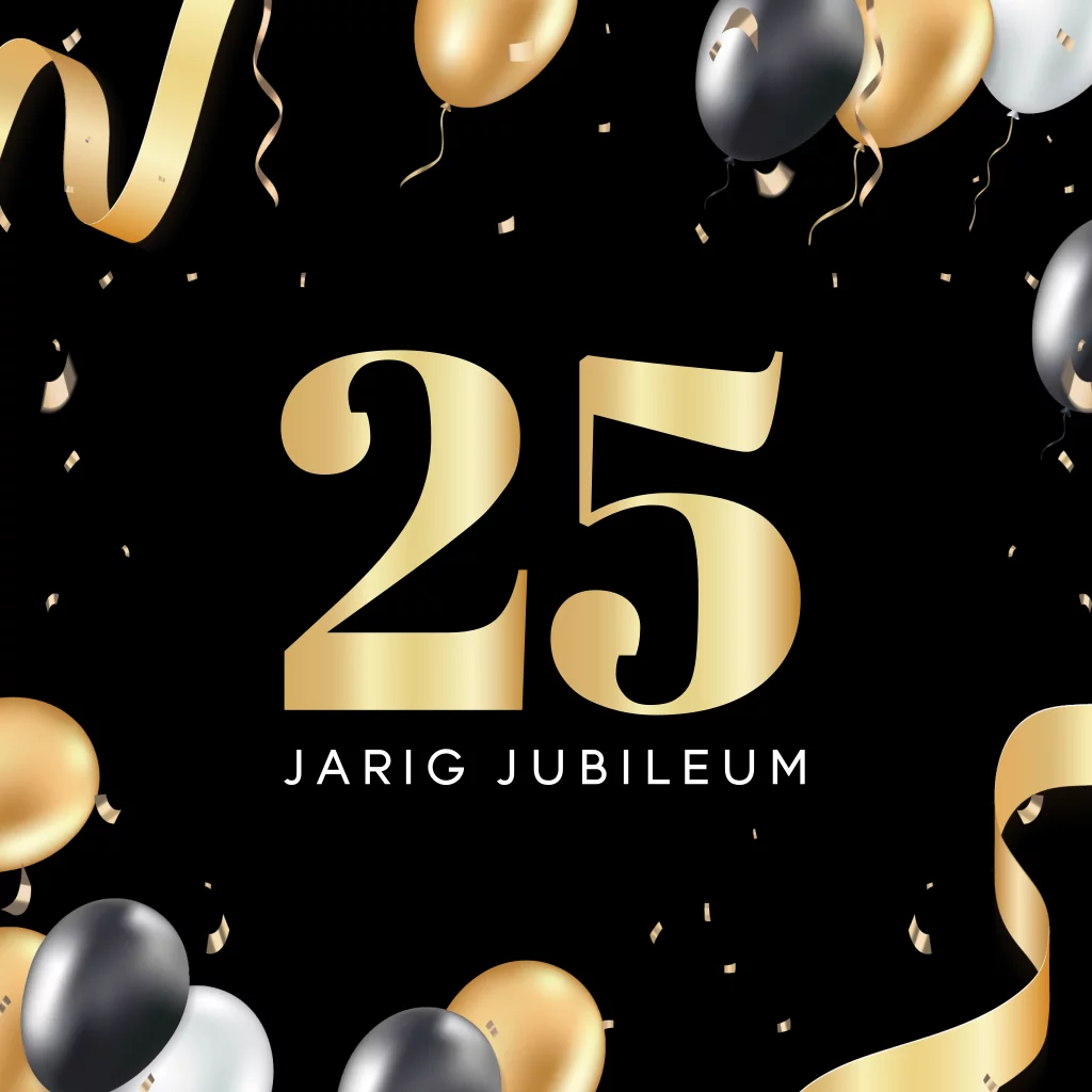 Zakelijke uitnodiging voor een 25-jarig zakelijk jubileum. Deze uitnodiging is feestelijk met een zwarte achtergrond met in goudlook groot het cijfer 25 en confetti met ballonnen. Een ander jubileumjaar om te vieren? We helpen je graag bij het aanpassen van deze kaart.