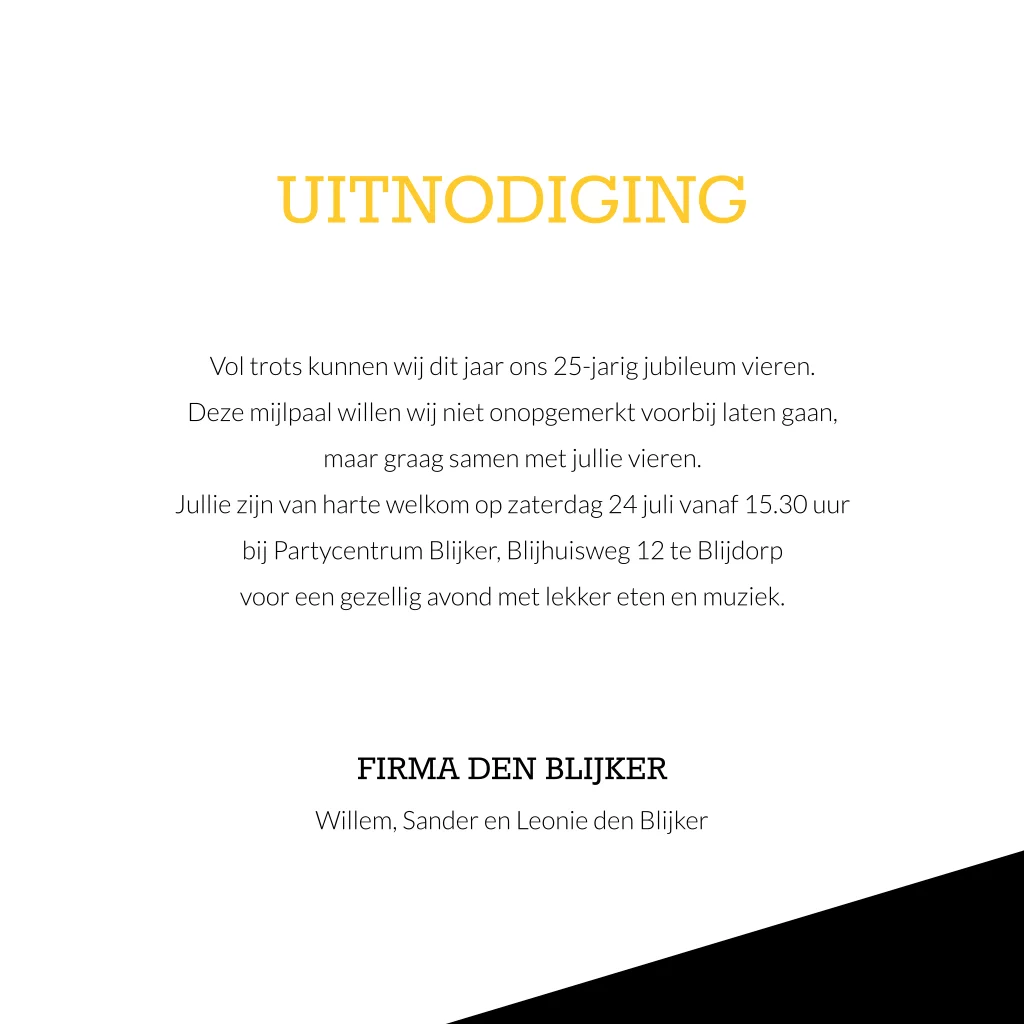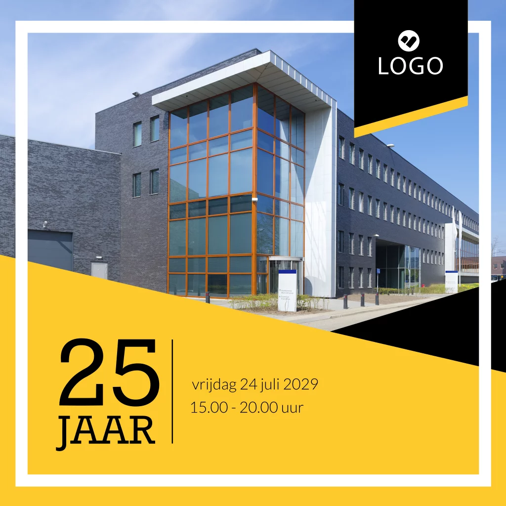 Strakke zakelijke uitnodiging voor een zakelijk jubileum van 25 jaar. Deze uitnodiging heeft een strak design met wit omrand kader en geel vlak. Vervang in de editor eenvoudig de foto door een eigen foto van jullie bedrijf. Ook het logo is eenvoudig aan te passen naar een eigen bedrijfslogo. De afbeelding van het logo dient als voorbeeld en wordt niet gedrukt. Deze kun je verwijderen of plaats hier je eigen logo overheen.