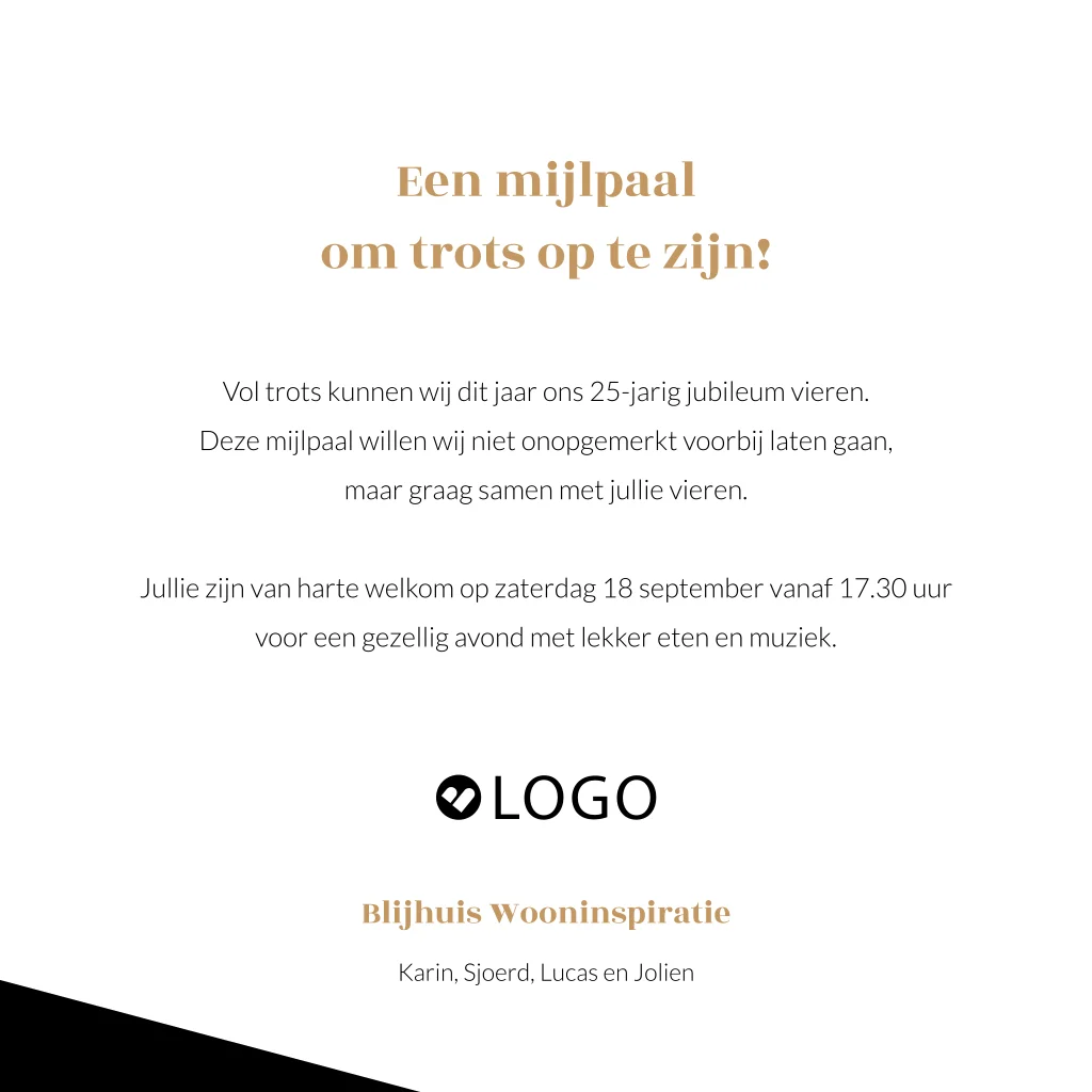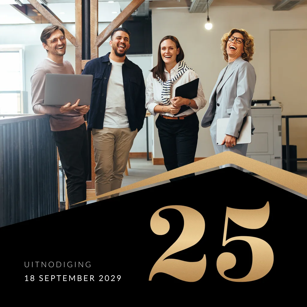 Stijlvolle en strakke jubileumkaart voor een 25-jarig zakelijk jubileum. De 25 heeft een mooie goudlook waardoor dit extra opvalt. Zet op deze jubileum uitnodigingskaart een eigen foto.