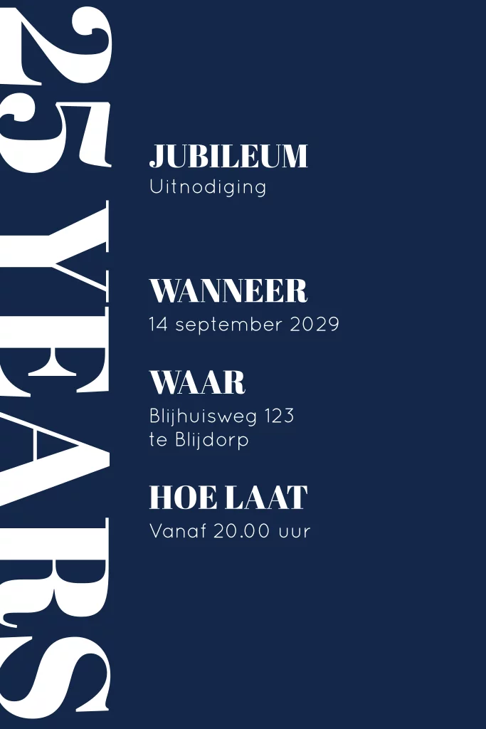 Typografische zakelijke uitnodiging voor een 25-jarig zakelijk jubileum. Deze uitnodiging heeft een strak design met blauwe achtergrond en witte letters. Zet op de achterzijde je eigen bedrijfslogo. De afbeelding van het logo dient als voorbeeld en wordt niet gedrukt. Deze kun je verwijderen of plaats hier je eigen logo overheen.