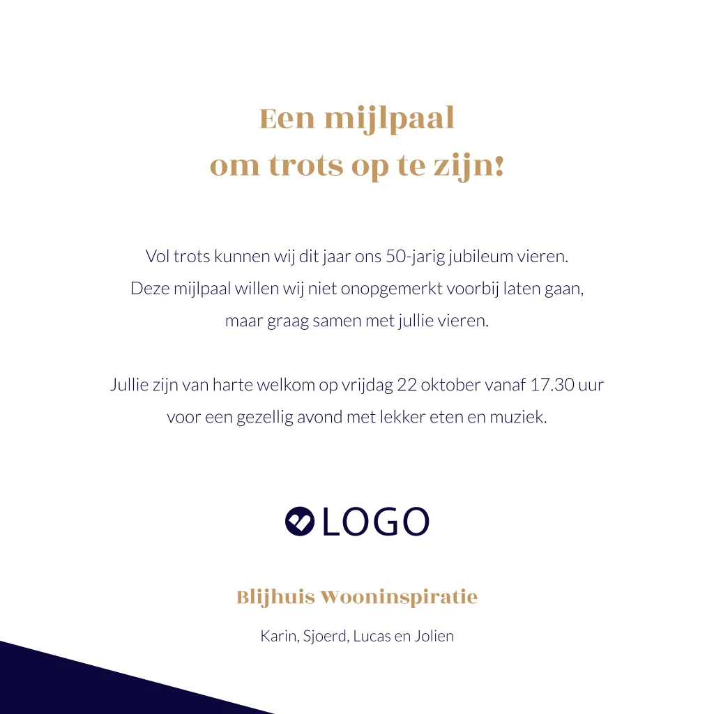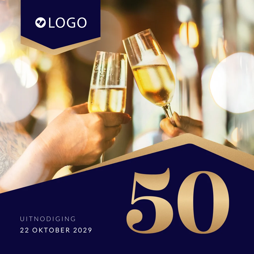 Stijlvolle jubileumkaart voor een 50-jarig zakelijk jubileum. Deze jubileum uitnodigingskaart met foto van champagne en 50 in grote goudlook cijfers kun je zelf gemakkelijk bewerken, opslaan en bestellen.
