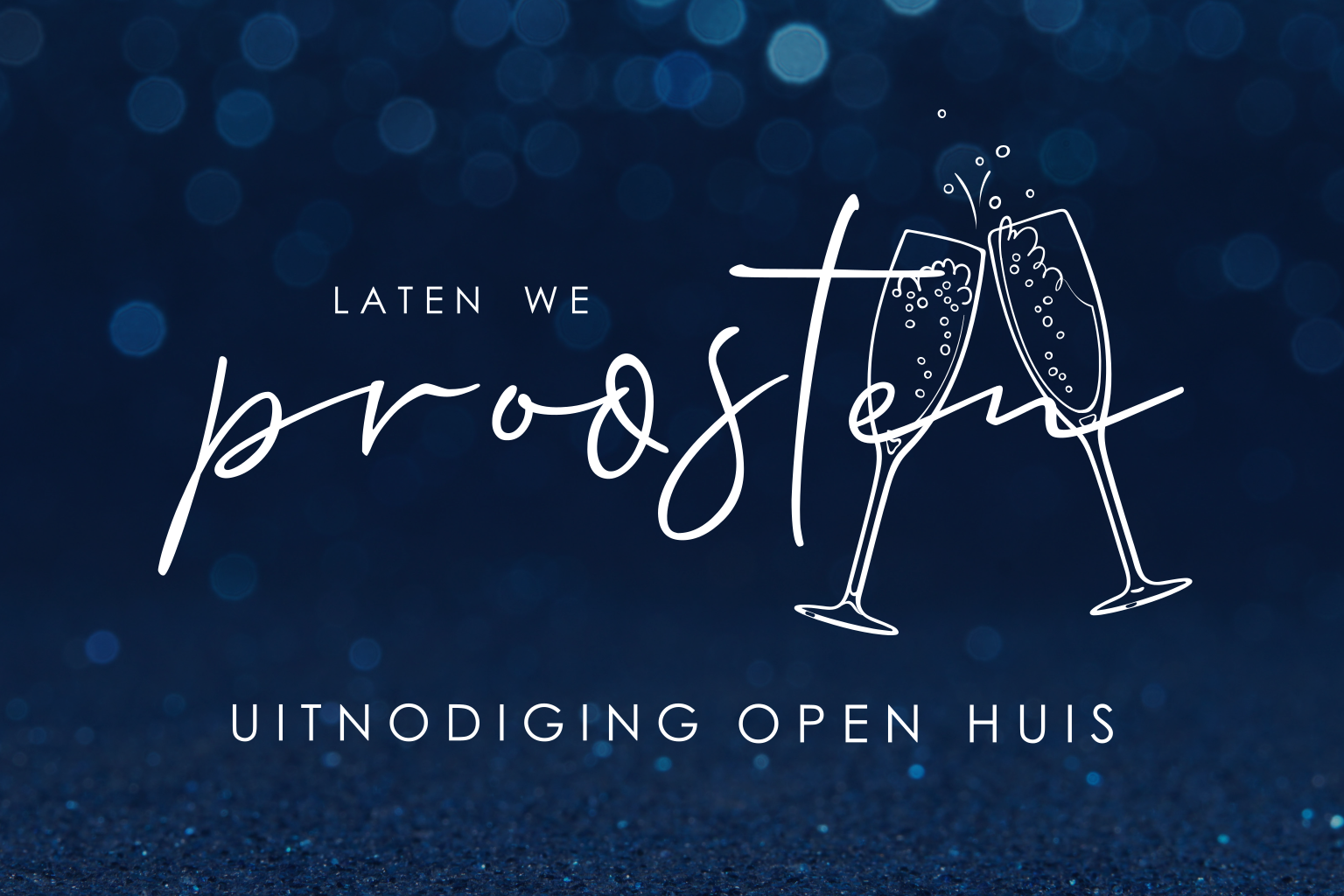 Zakelijke uitnodiging om te proosten op een verhuizing of een nieuw bedrijfspand. Deze luxe uitnodigingskaart is voorzien van goudfolie, dit geeft een extra luxe uitstraling. Op de binnenzijde is ruimte voor een foto en jullie eigen logo. De kaart heeft een sprankelende blauwe achtergrond en de proostende champagneglazen maken het extra feestelijk.