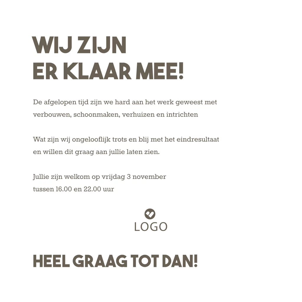 Zakelijke uitnodiging voor een open huis. Op deze zakelijke kaart is ruimte om een eigen foto te plaatsen van jullie nieuwe setting. De bruine achtergrond met wit kader en organische goudlook lijn geven deze uitnodiging een neutrale maar toch chique uitstraling. Deze uitnodigingskaart kun je zelf gemakkelijk bewerken, opslaan en bestellen.
