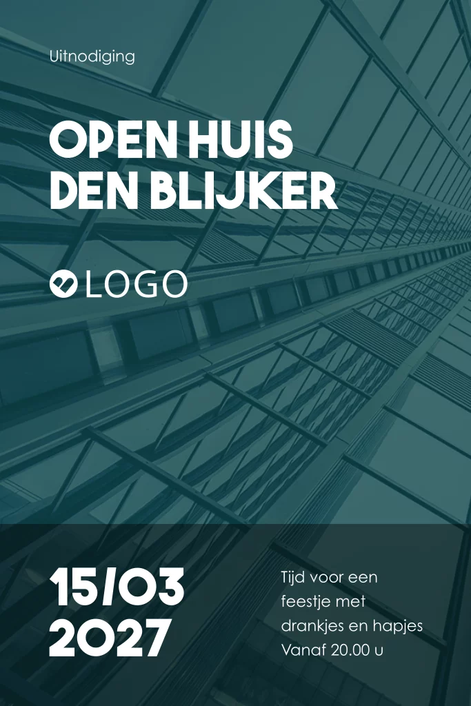 Zakelijke uitnodiging voor een open huis. De donkergroene achtergrond met het sfeerbeeld op de achtergrond maakt het een strak ontwerp. Op de voorzijde is ruimte voor het logo. De ronde hoeken geven een extra mooi effect.