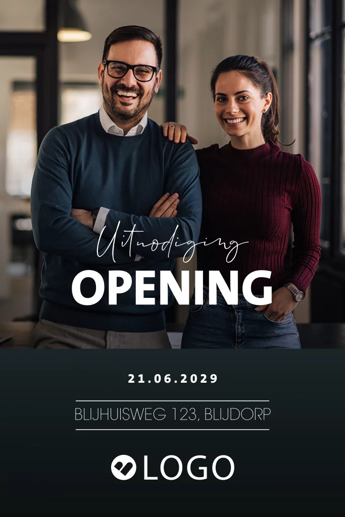 Moderne typografische uitnodiging eigen foto en logo. Pas deze zakelijke uitnodiging voor een opening naar je eigen smaak aan in de editor. Hulp nodig bij het ontwerpen? Neem contact met ons op!