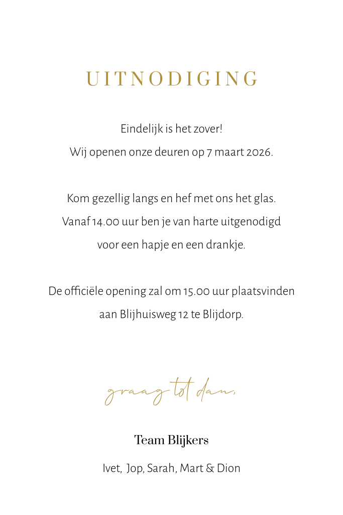 Een zakelijke uitnodigingskaart voor een feestelijke opening, geschikt voor veel bedrijven. Deze zakelijke kaart is voorzien van een feestelijke foto met proostende champagneglazen. Pas de foto samen met de tekst eenvoudig aan in de editor. Hulp nodig bij het ontwerpen? Laat het ons gerust weten.