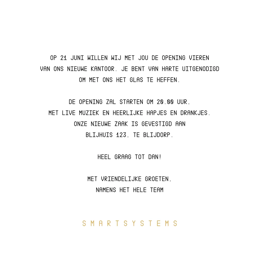Organiseer jij een feestelijke opening voor je nieuwe zaak? Met deze uitnodigingskaart nodig je familie, vrienden en zakelijke relaties uit om jouw nieuwe bedrijf te komen bekijken. Op de voorzijde kun je 2 mooie foto's toevoegen met daartussen ruimte voor je eigen bedrijfslogo. Teksten, kleuren en lettertypes zijn aan te passen in onze ontwerpmodule. Kom je er zelf niet uit? We helpen je graag!