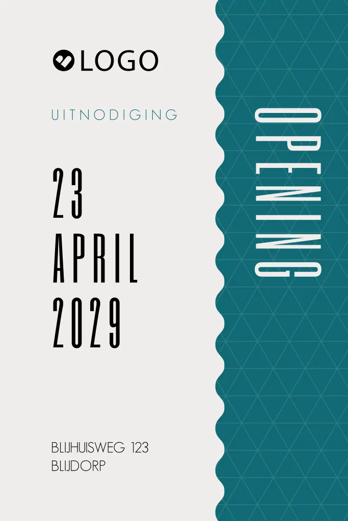 Moderne zakelijke uitnodiging met golvend kader met geometrisch patroon. Vier de opening van jullie (verbouwde) zaak met deze zakelijke uitnodiging. Op de voor- en achterzijde is ruimte voor je eigen logo. De afbeelding van het logo dient als voorbeeld en wordt niet gedrukt. Deze kun je verwijderen of plaats hier je eigen logo overheen.