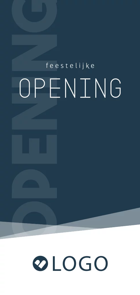 Strakke uitnodiging voor de zakelijke opening van jouw bedrijf. Op de voorzijde is ruimte voor het logo van jouw bedrijf. Door de donkerblauwe achtergrondkleur past deze uitnodiging bij elke bedrijf. Je past kleuren, lettertypes en afbeeldingen heel makkelijk zelf aan in de online editor.