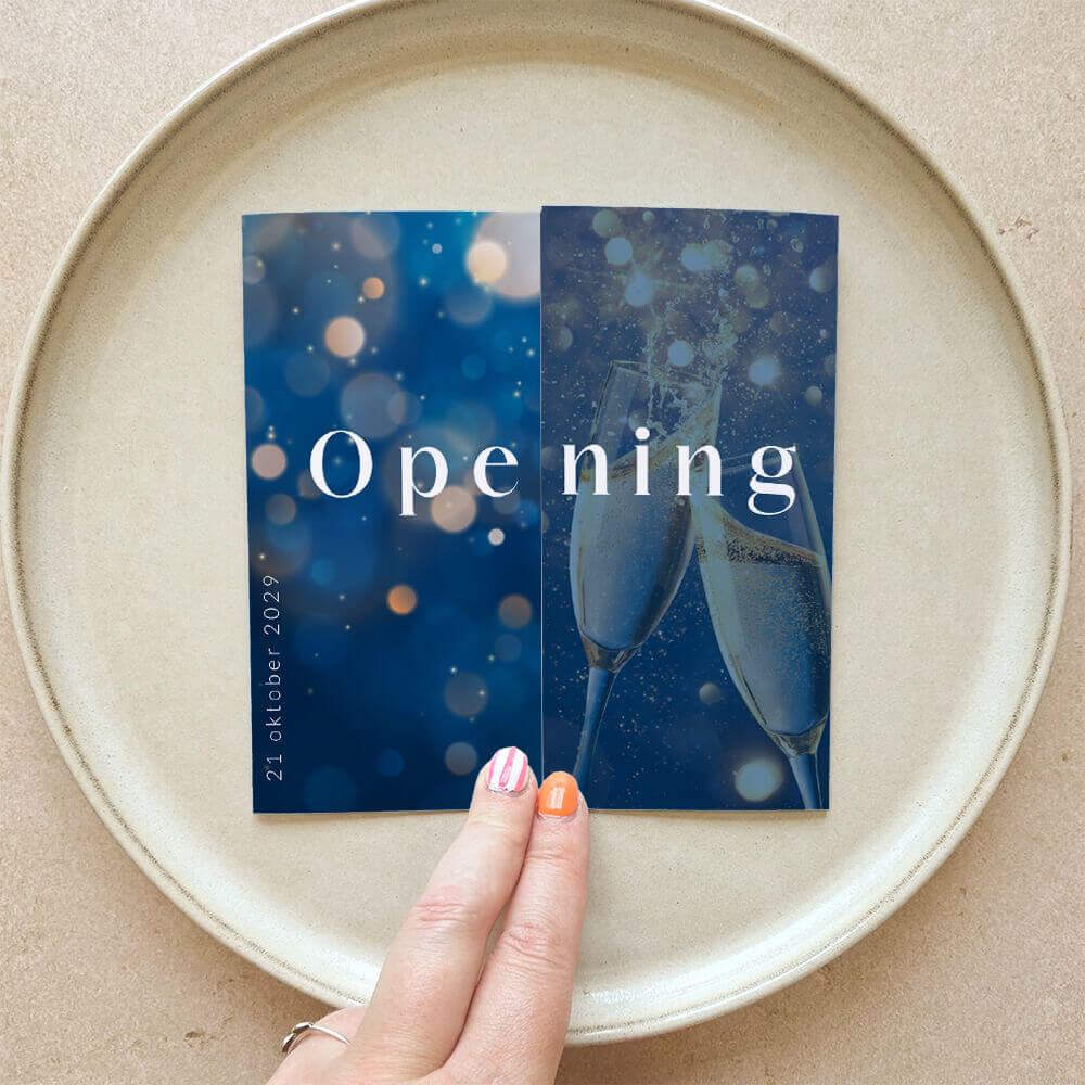 Luxe zakelijke opening uitnodiging met theatervouw en champagneglazen