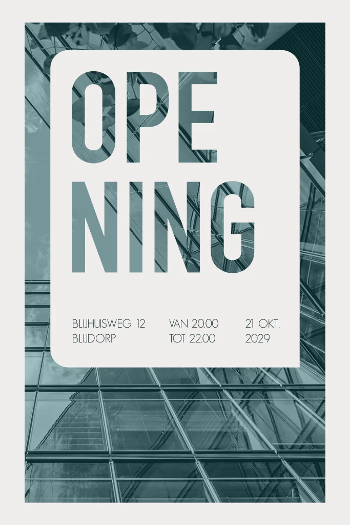 Moderne typografische uitnodiging voor een zakelijke opening met ruimte voor een eigen foto. Deze zakelijke uitnodiging heeft een basic design. Pas deze zakelijke uitnodiging naar je eigen smaak aan in de editor.