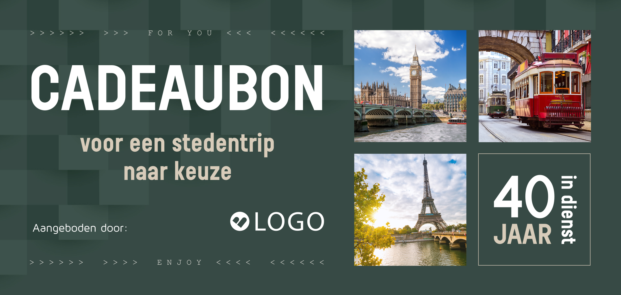 Zakelijke waardebon om medewerkers te verrassen met een stedentripje naar keuze. Op de waardebon is ruimte voor foto's van het bedrijf of naar de bestemming van de stedentrip. Ook is er ruimte voor het logo van het bedrijf.
