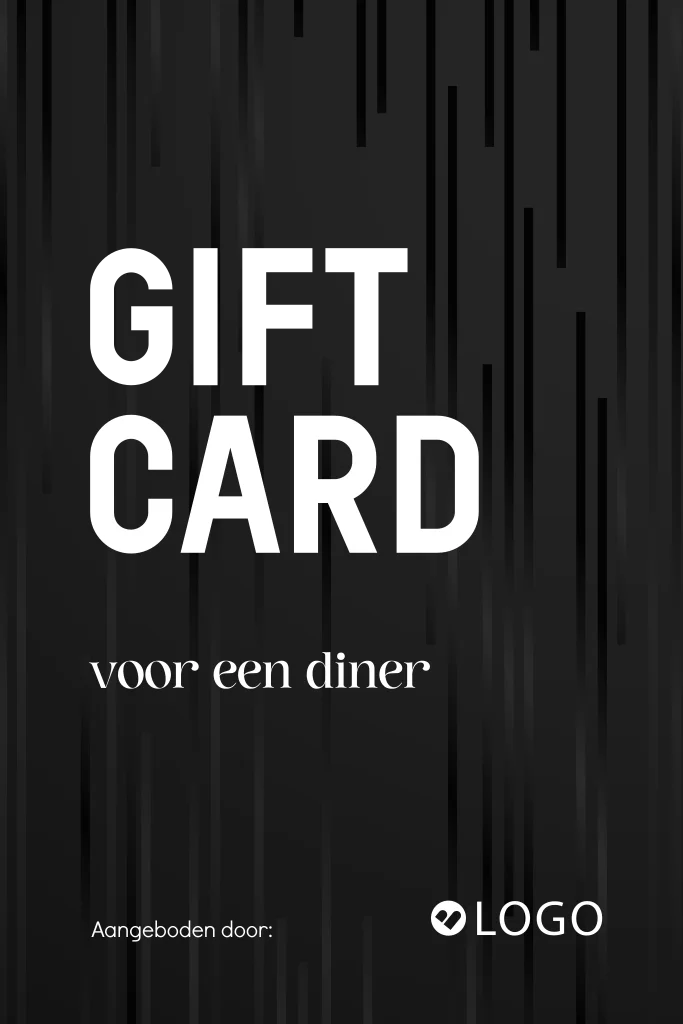 Zakelijke waardebon om je medewerker een diner cadeau te doen ter ere van zijn of haar jubileum! Deze staande, enkele kaart heeft een zwarte achtergrond met de luxe toevoeging van goudfolie. Op de voorzijde is ruimte voor het logo van jouw bedrijf.