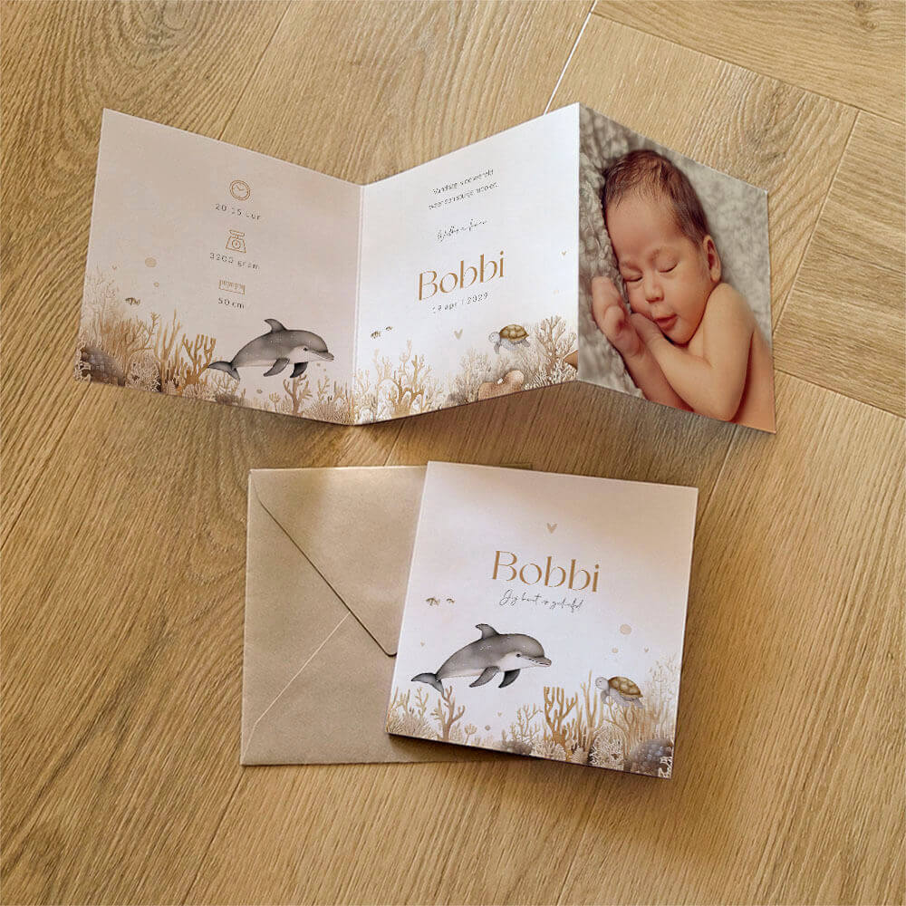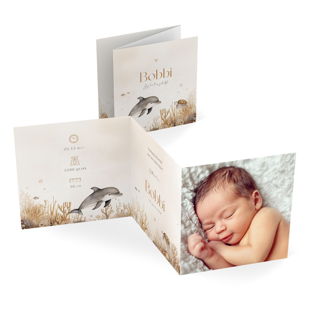 Wat een prachtig en uniek unisex geboortekaartje in onderwaterwereld thema met dolfijn, schildpad en walvisje. Dit geboortekaartje Bobbi is een zigzag geboortekaartje met drie zijdes, waarop op 1 zijde ruimte is voor een foto van jullie kleintje. Dit drieluik geboortekaartje is eenvoudig aan te passen in de editor, waardoor jullie het helemaal naar wens kunnen maken. Met een envelop in metallic beige en een sluitzegel met een prachtige aquarel onderwaterwereld van een walvis, straalt dit geboortekaartje een natuurlijke en liefdevolle sfeer uit.