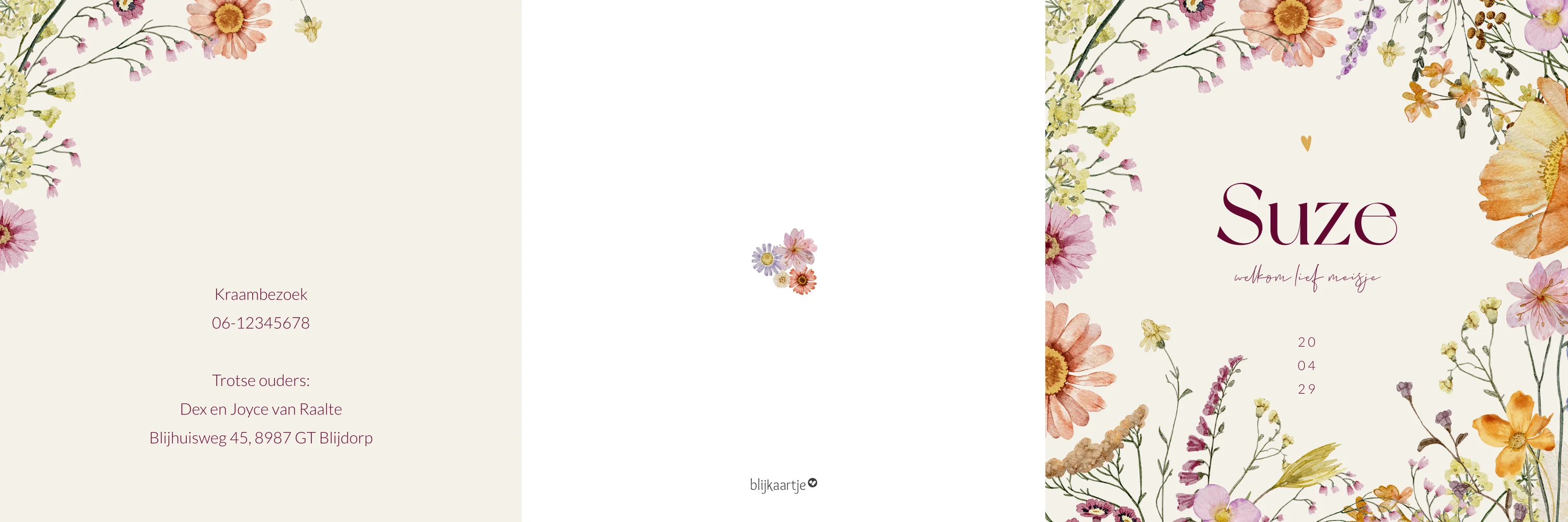 Trek de aandacht met dit bijzondere drieluik geboortekaartje met zigzag-vouw voor een meisje. Op dit geboortekaartje Suze zie je vrolijke kleurrijke bloemen. Een perfect geboortekaartje voor een echte zomerbaby!