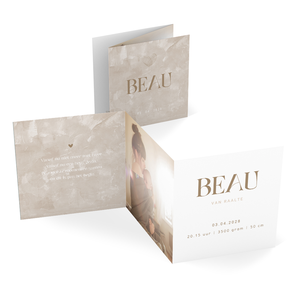 Het geboortekaartje heeft neutrale beige kleuren en dit zorgt voor een rustig effect voor het geboortekaartje van jullie zoon of dochter. Je ziet een beige betonlook als achtergrond en twee vingerafdrukken in de vorm van een hartje. Door het drieluik heb je genoeg ruimte om je teksten en afbeeldingen kwijt te kunnen. Aan de binnenzijde van het drieluik kun je een eigen foto plaatsen van jullie kindje. Maak het geboortekaartje af met een bijpassende envelop en sluitzegel.