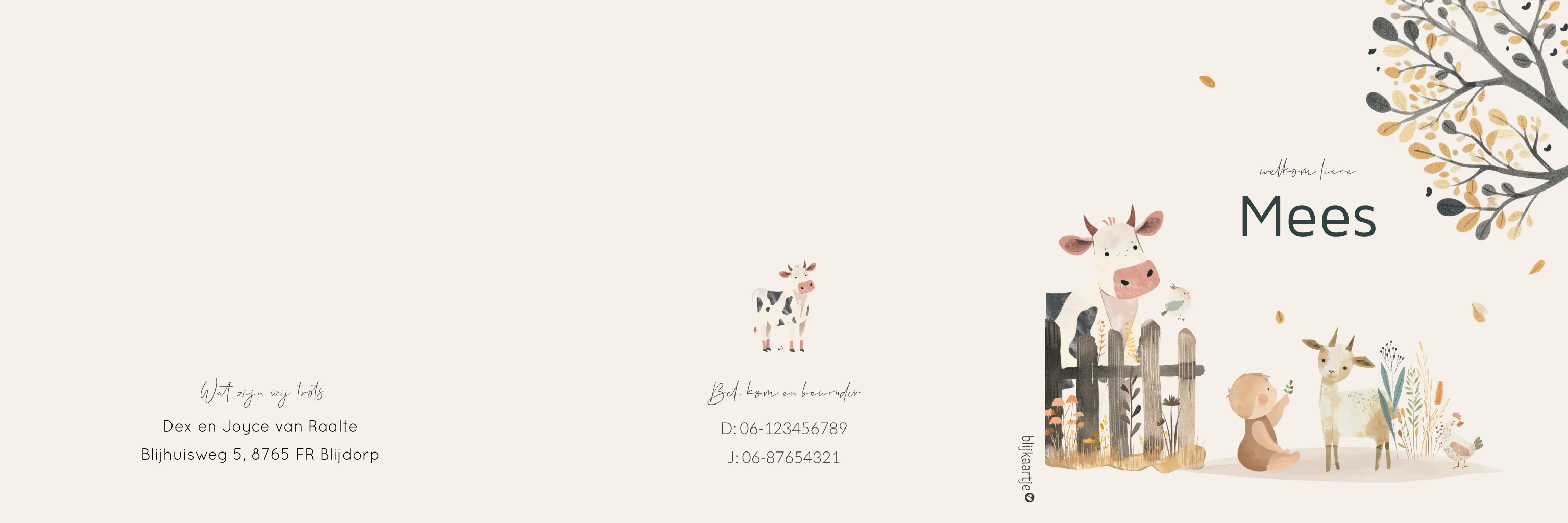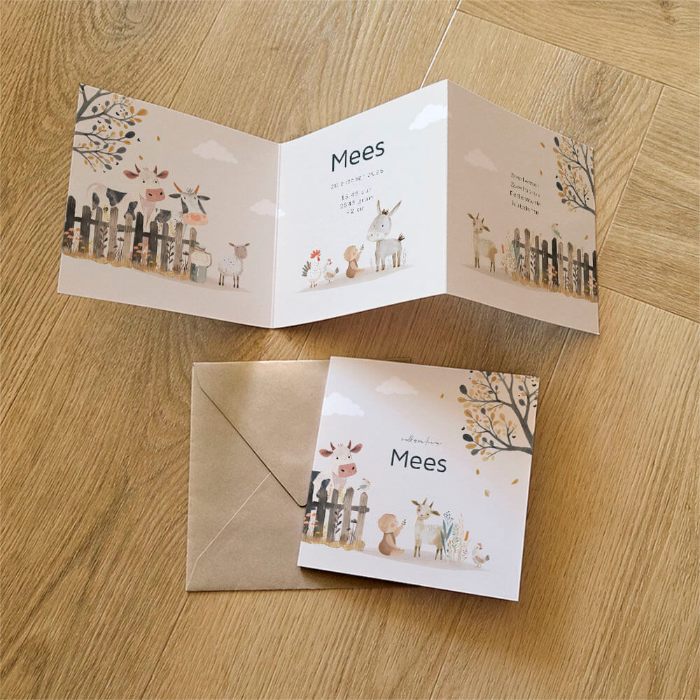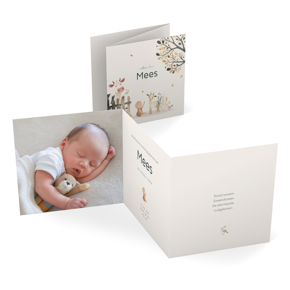 Vier de geboorte van jullie zoon met dit bijzondere drieluik geboortekaartje met zigzag-vouw voor een jongen. Dit geboortekaartje Mees is voorzien van verschillende illustraties omtrent het thema boerderij. Je ziet een kleine baby met een koe en geit. De boom laat de bladeren vallen, ook een geschikt kaartje voor een herfstbaby. In de binnenzijde van het geboortekaartje kun je een eigen foto toevoegen van jullie zoontje. Door de zigzag-vouw heb je drie delen en daardoor genoeg ruimte om je teksten en afbeeldingen kwijt te kunnen. Maak het af met een bijpassende envelop en sluitzegel.Meer inspiratie: