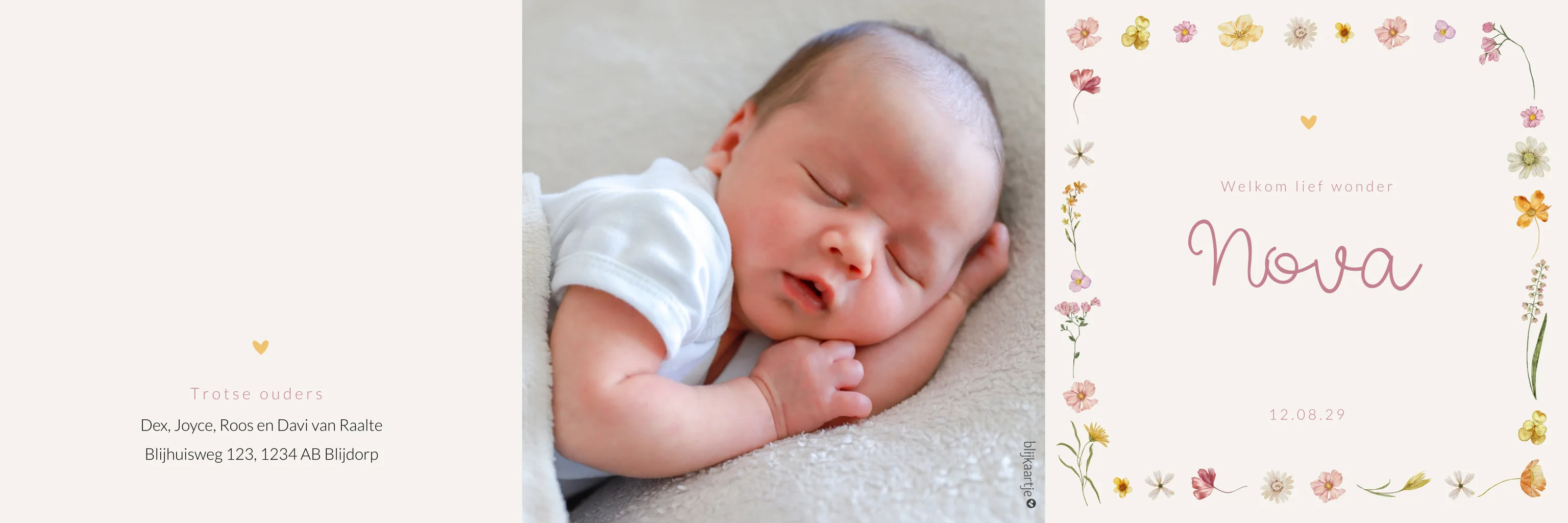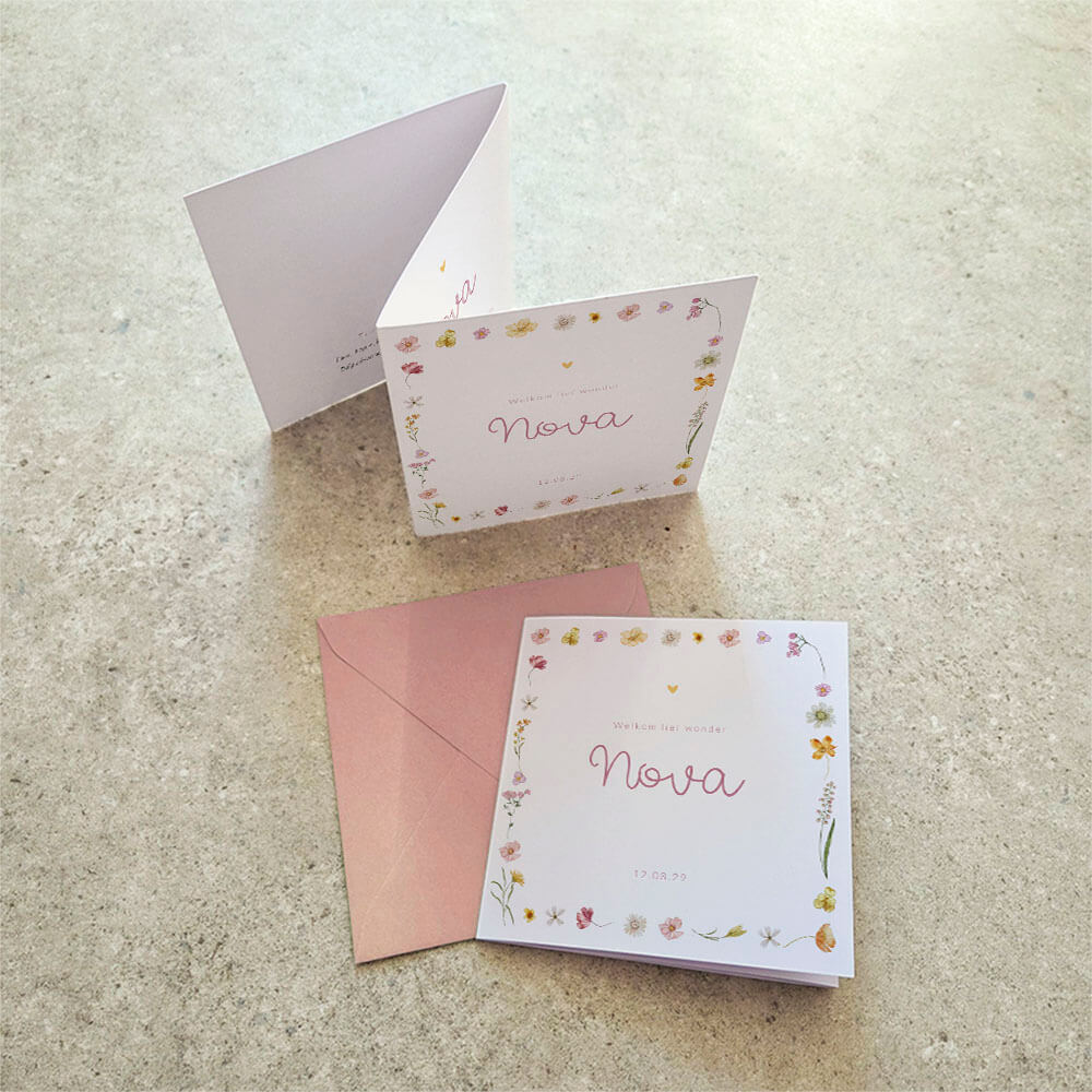Trek de aandacht met dit bijzondere zigzag gevouwen geboortekaartje voor een meisje. Dit geboortekaartje Nova is voorzien van een romantisch bloemetjes kader met hartjes. De bloemen zijn kleurrijk waardoor dit een vrolijk geboortekaartje voor een meisje is. Door de drieluik heb je genoeg ruimte om je teksten en afbeeldingen kwijt te kunnen. Maak het af met een bijpassende envelop en sluitzegel.| Totaalprijs: 0 |