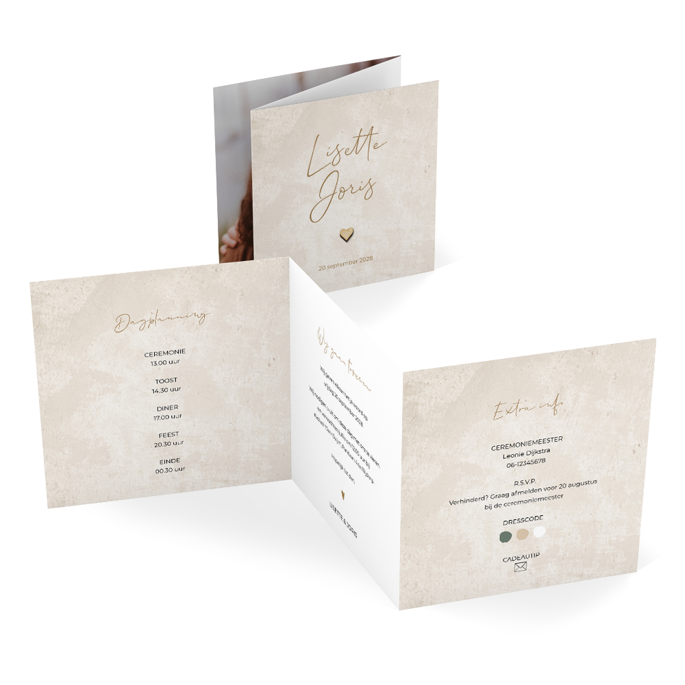 Deze trouwkaart in drieluik stijl is perfect voor een rustige en ontspannen bruiloft. Door de drieluik met zigzag-vouw heb je extra ruimte om alle informatie over jullie grote dag kwijt te kunnen, hoe handig! Deze trouwkaart heeft een rustig beige ontwerp met een écht houten hartje. Zet op de binnenzijde van de kaart een romantische foto van jullie als stralend stel.