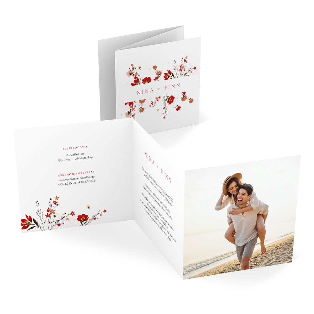 Deze prachtige zigzag gevouwen drieluik trouwkaart met opvallende rode bloemen is de perfecte keuze voor een kleurrijke bruiloftsuitnodiging. In de binnenkant van de kaart kun je een eigen foto toevoegen van jullie als stel en dit maakt de uitnodiging extra persoonlijk. De witte achtergrond in combinatie met de fleurige rode bloemen zorgt voor een heldere en frisse uitstraling. Rood is de kleur van de liefde en daarom zeker geschikt voor jullie uitnodiging! De gehele drieluik kaart kun je naar eigen wens aanpassen in de online editor.